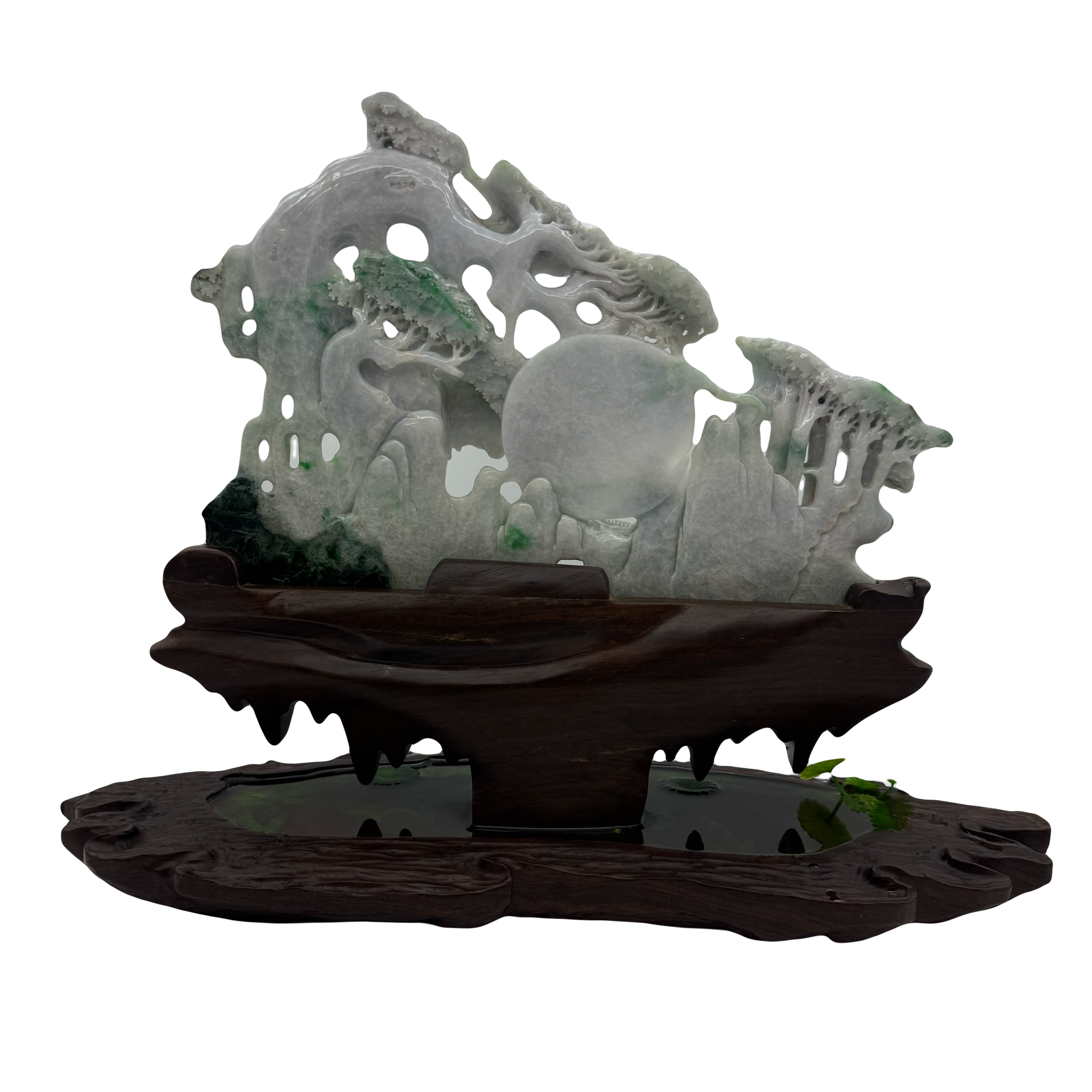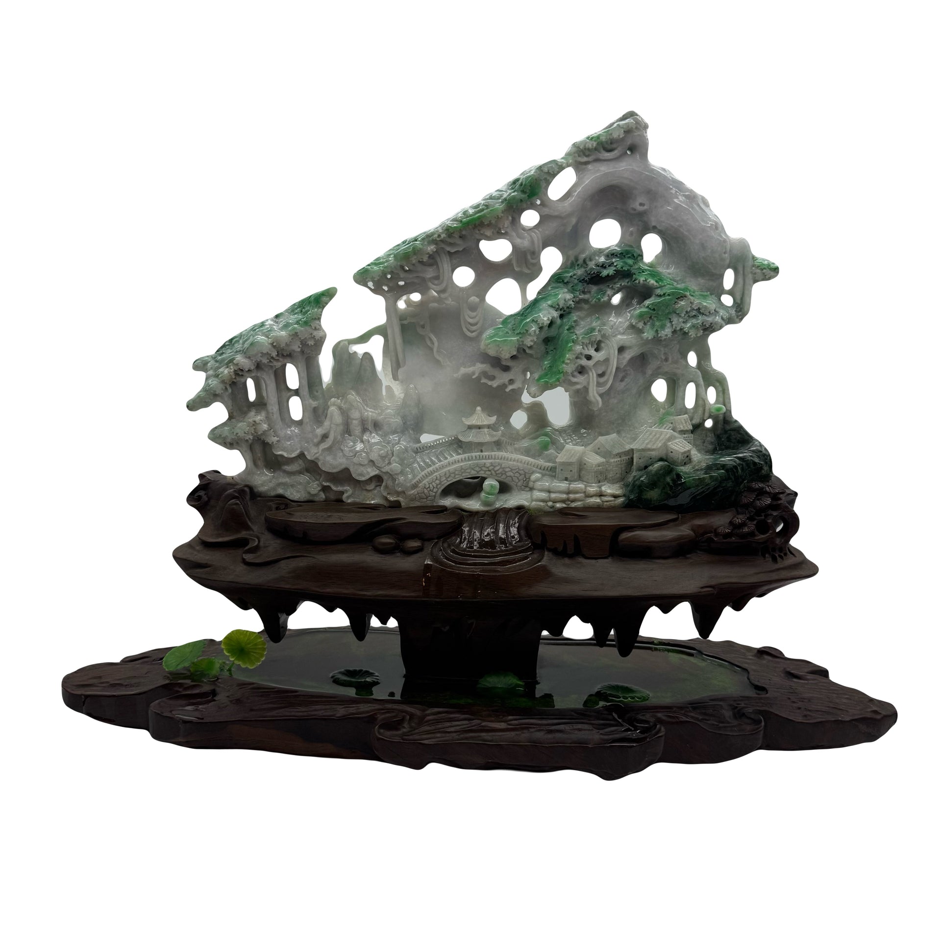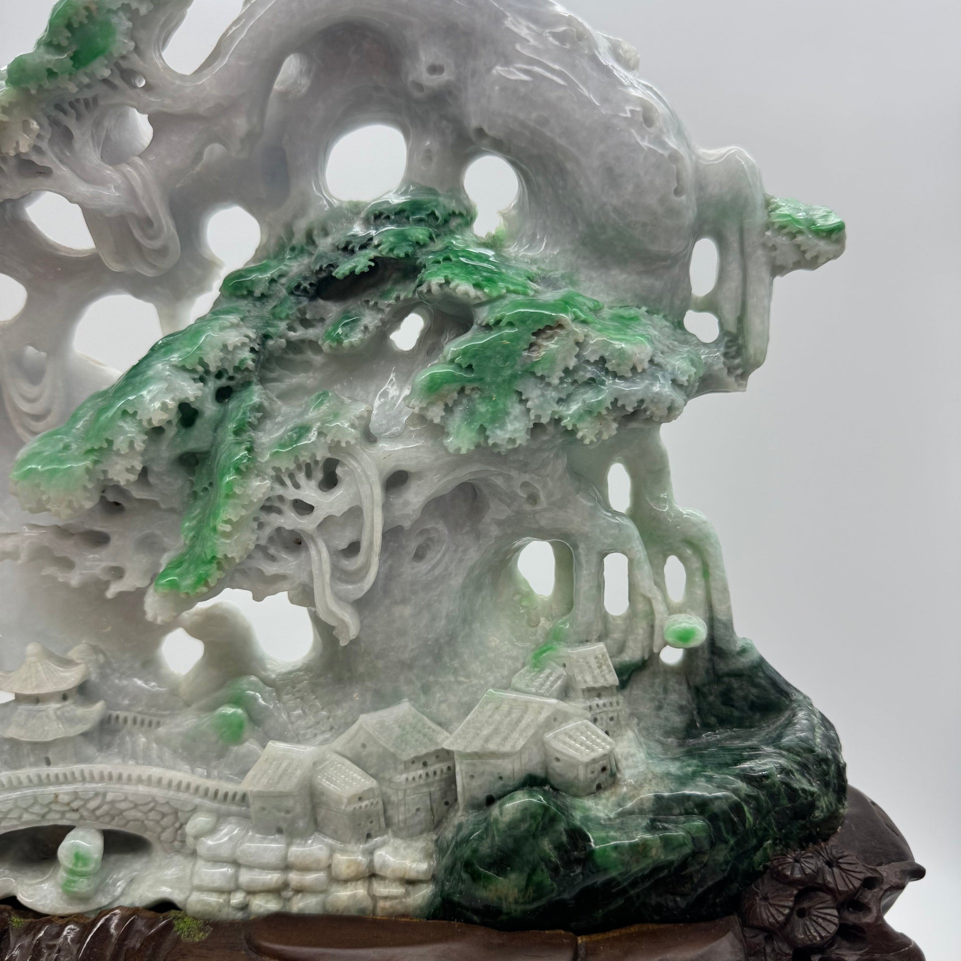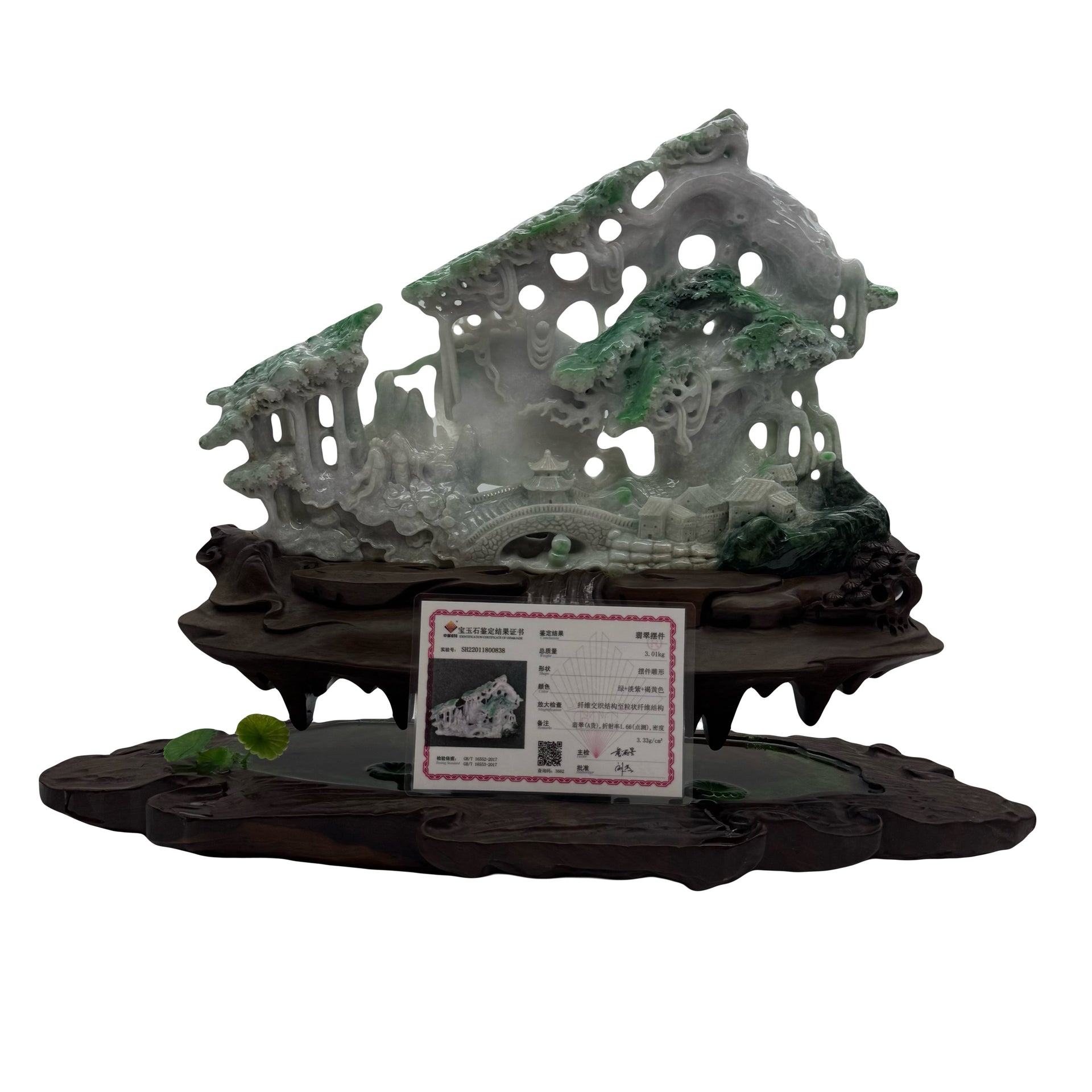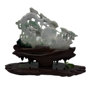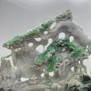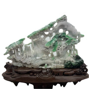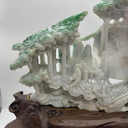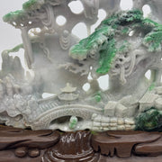 Type A Green, Yellow & Spicy Green Jade Jadeite Shan Shui 摆件多子多福 with Wooden Stand Display Piece - 3.015kg Dimensions with Stand - 51 by 40 by 19cm Jade Dimensions - 37 by 24 by 5cm