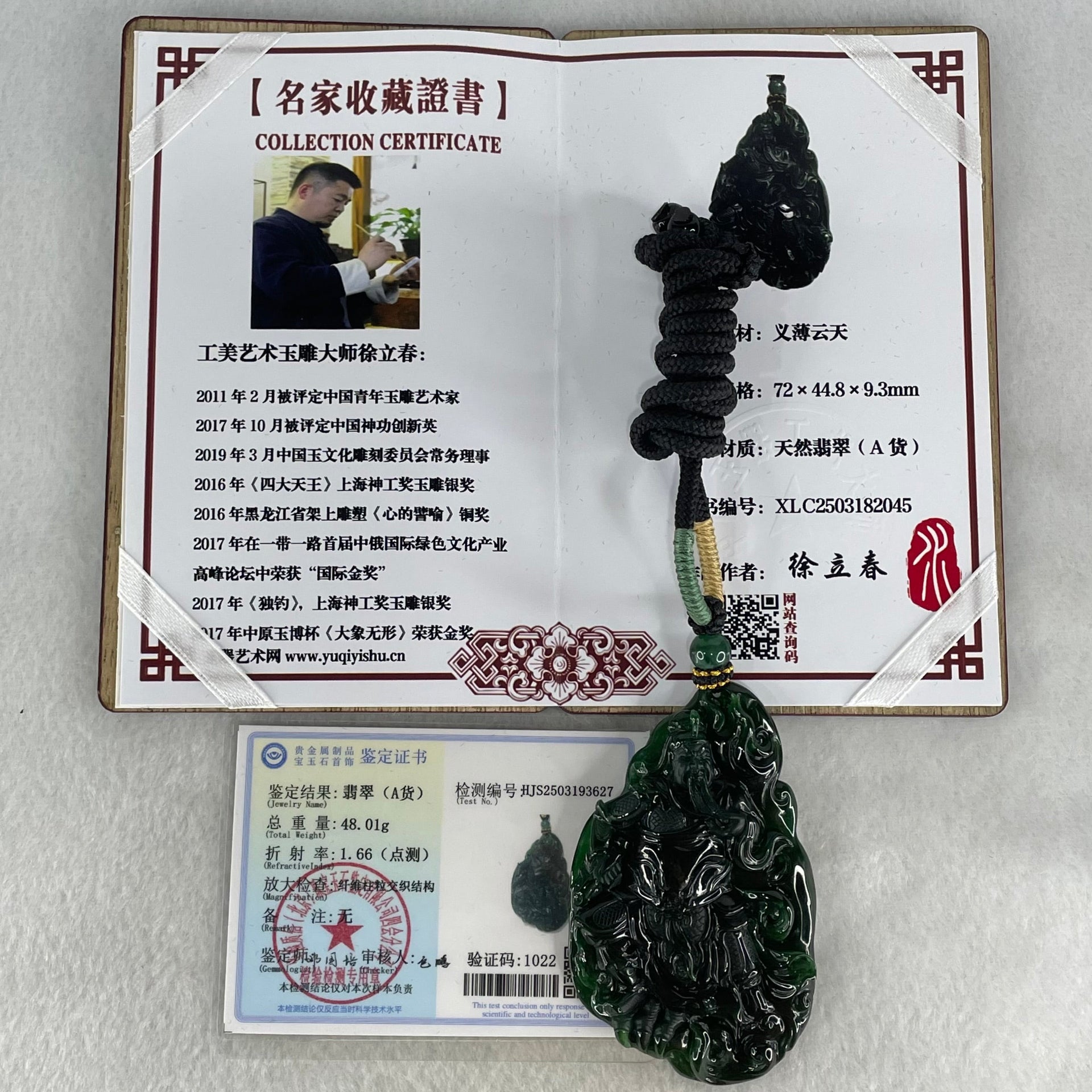 Experience the pinnacle of gemstone artistry with this Grand Master Type A Full Green Jadeite pendant. This is a rare acquisition for the serious connoisseur—a substantial 48.01g of untreated, natural jadeite featuring a vibrant, "Full Green" saturation that permeates the entire stone.