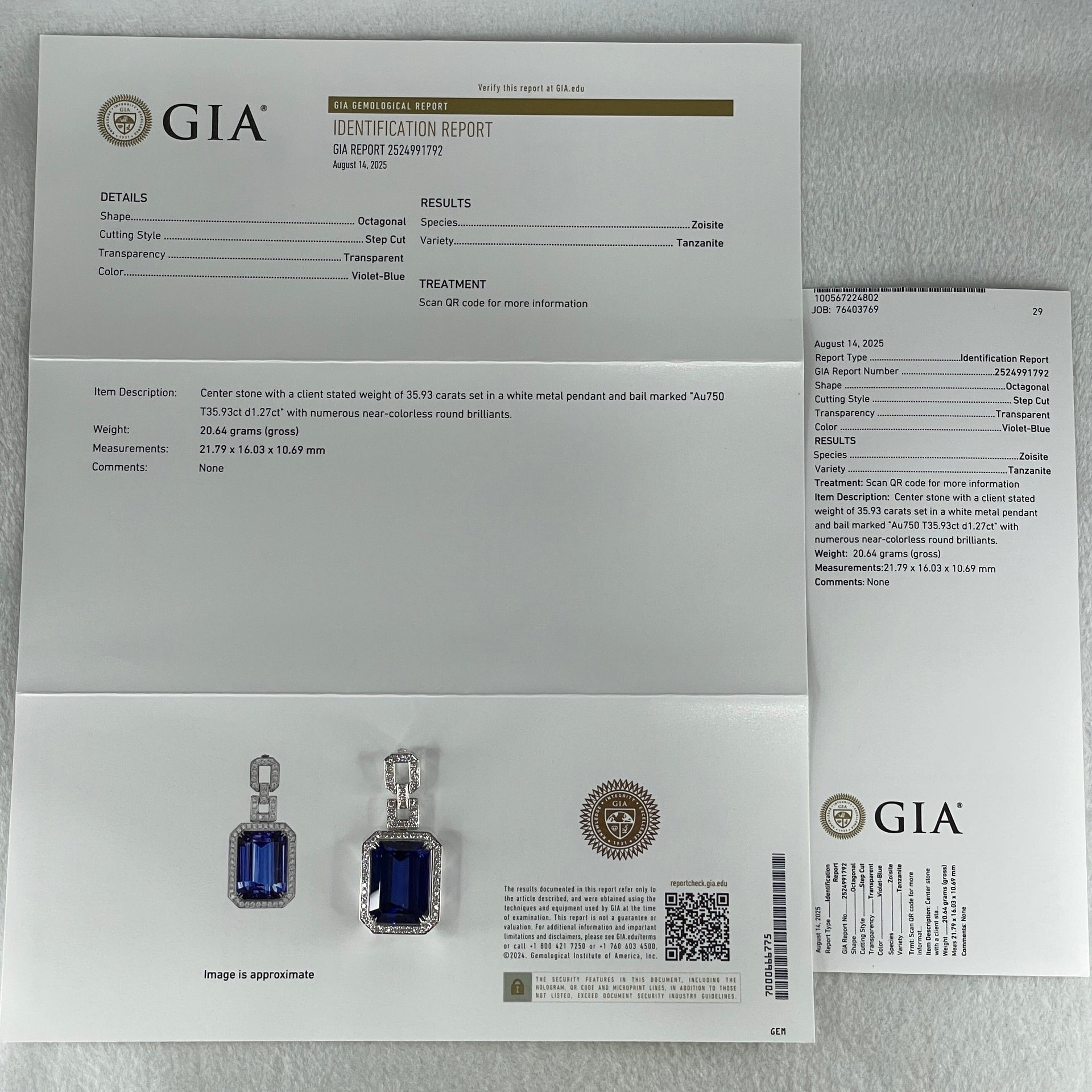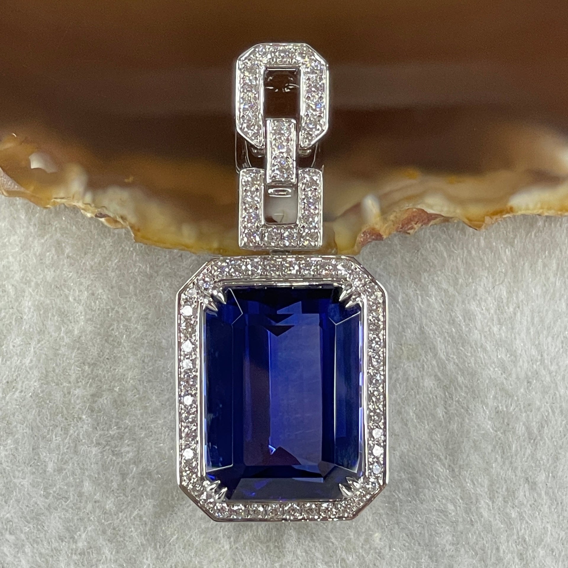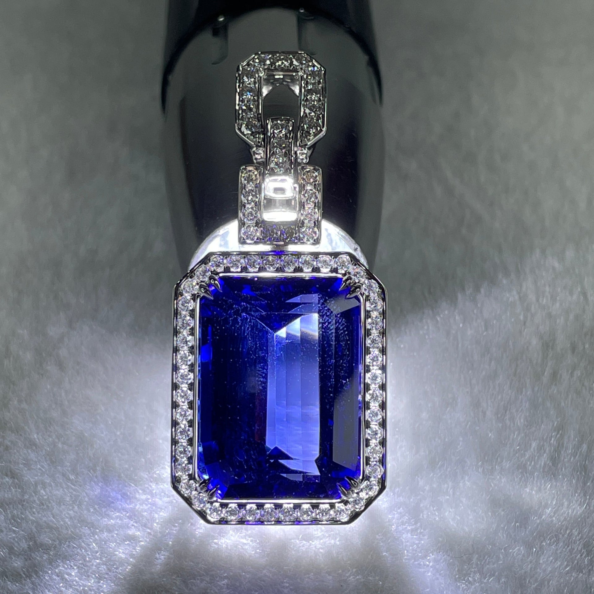 GIA Certified Very High Grade Natural Blue Tanzanite 35.93ct 21.79 by 16.03 by 10.69mm Natural Diamonds 1.27ct Au750 White Gold Pendant Total 20.64g