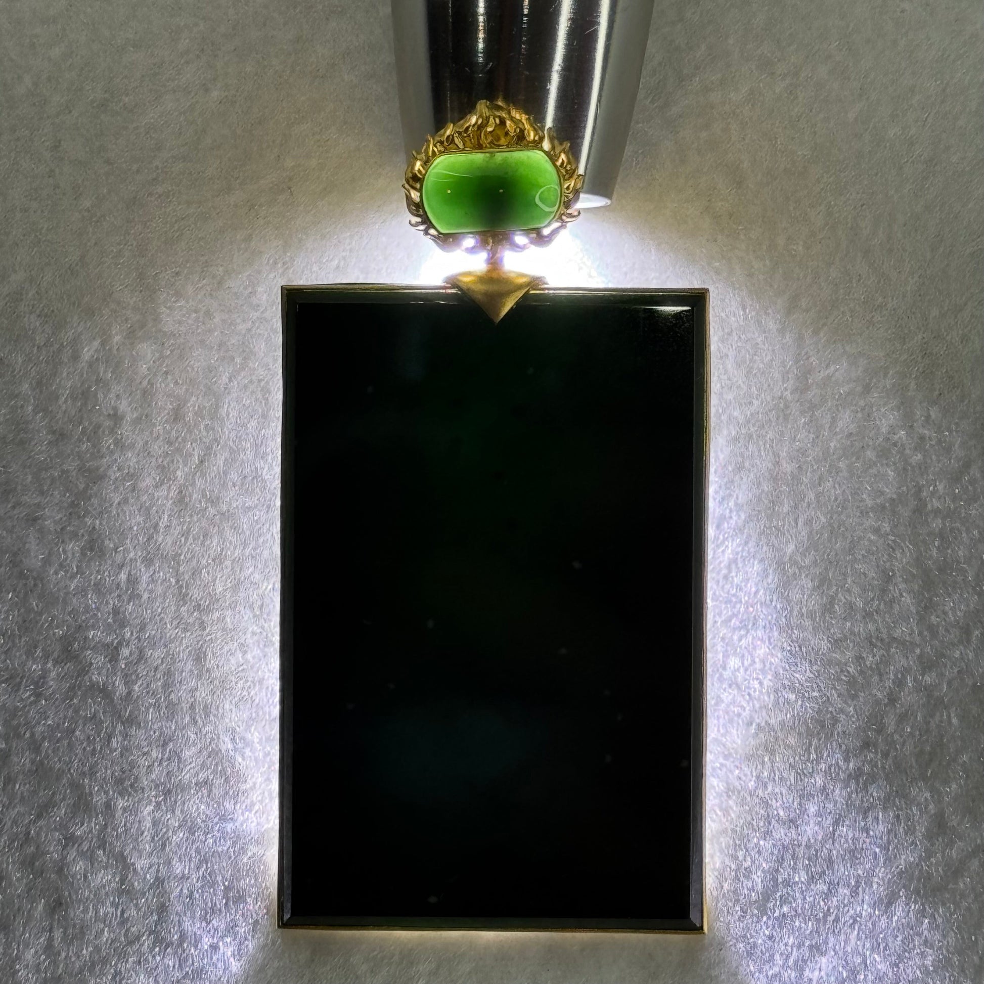 18k Yellow Gold Rare High Grade Fully Translucent Type A Black Jadeite Rectangle Wu Shi Pai Pendant 45.38g 61.8 by 41.2 by 4.8mm