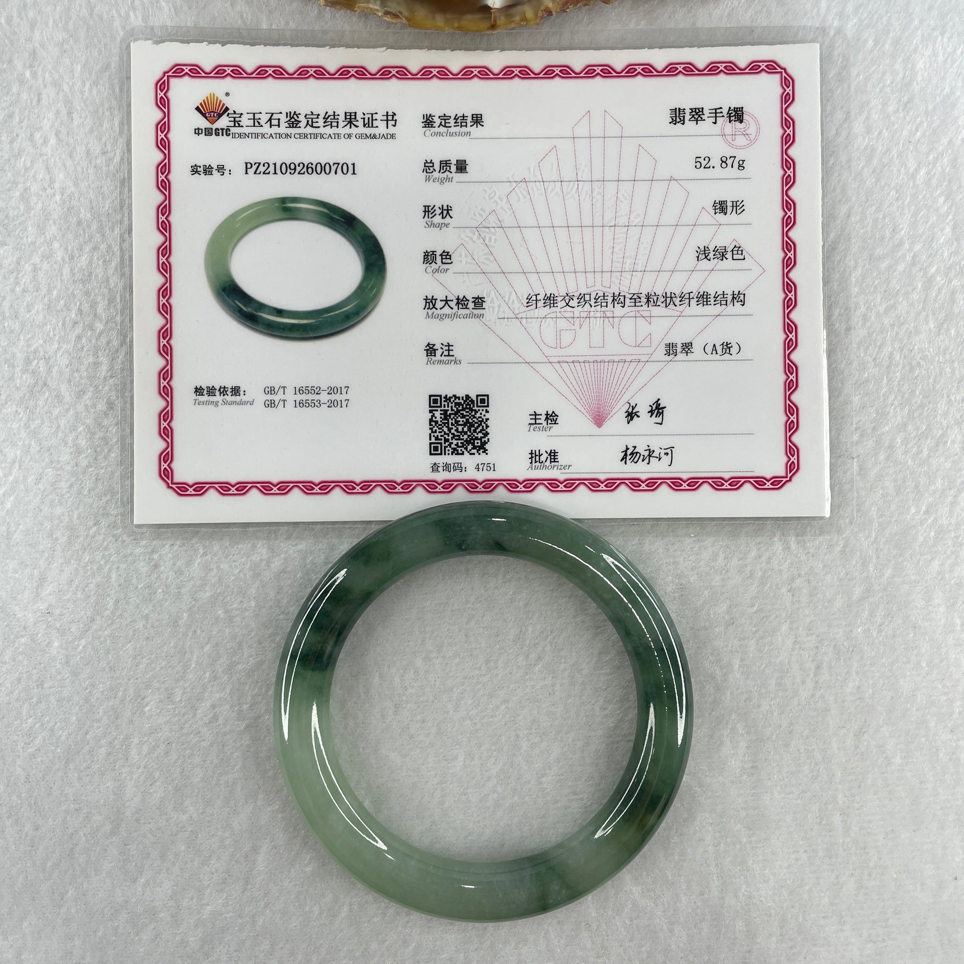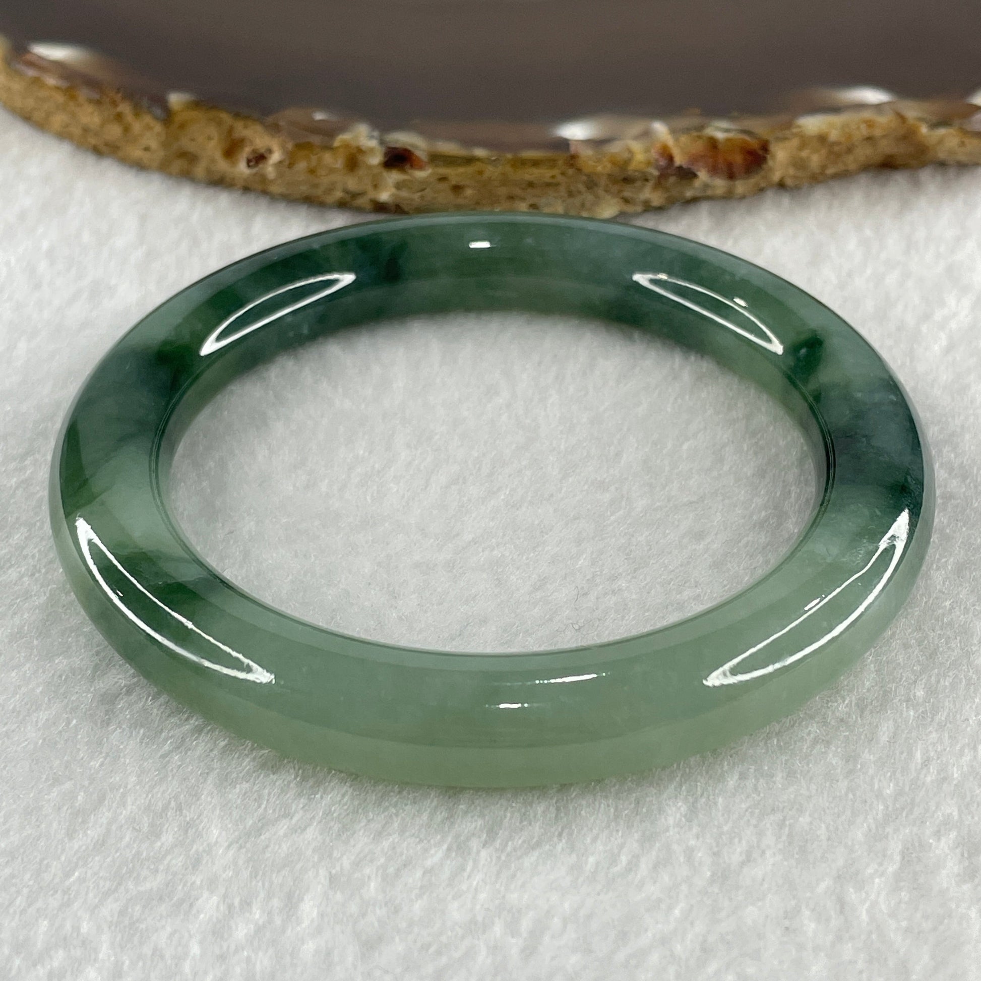 Certified Type A Natural Jelly Green with Dark Green Piao Hua Jadeite Bangle 52.87g Inner Diameter 56.0mm 9.5 by 10.1mm (Very Very Slight External Rough)