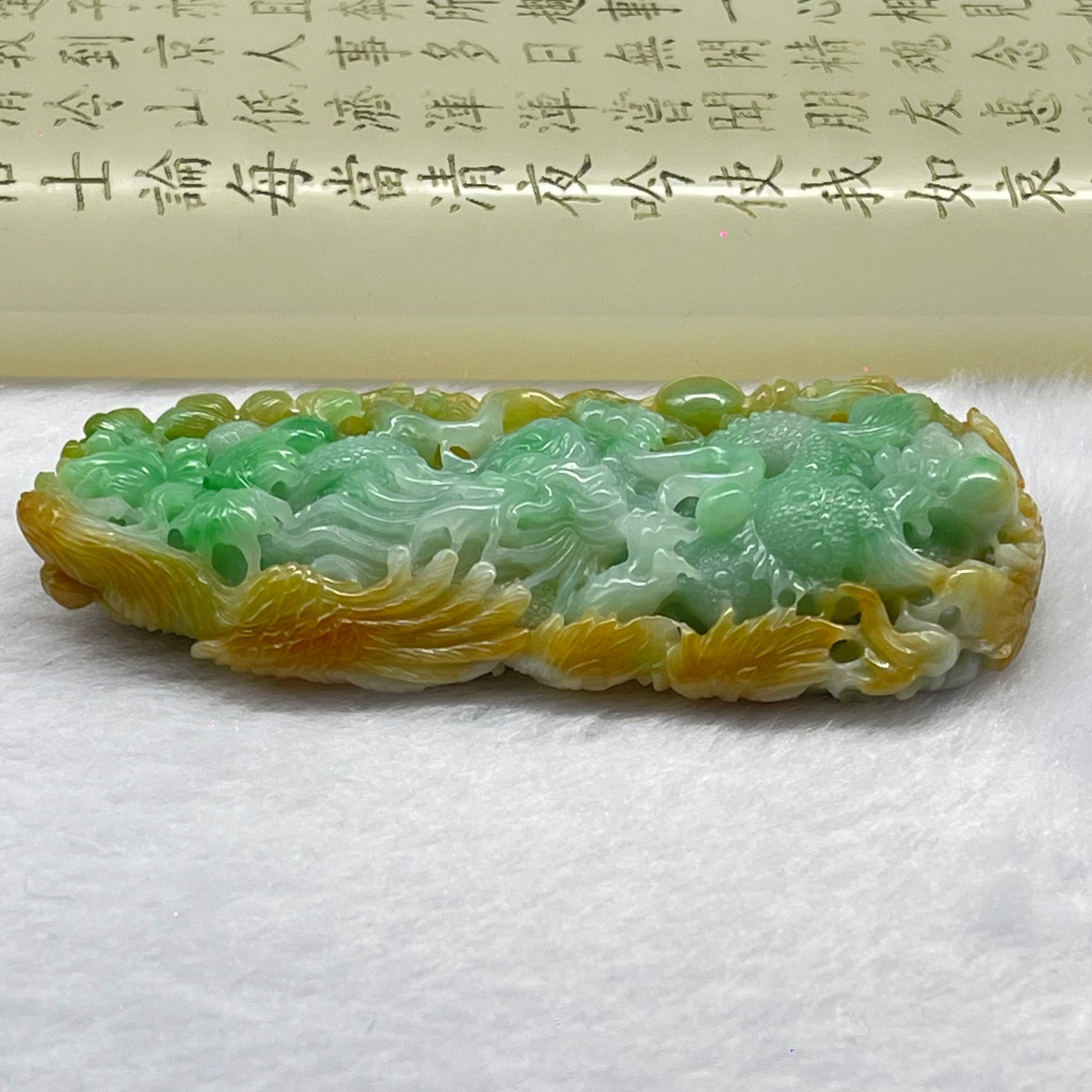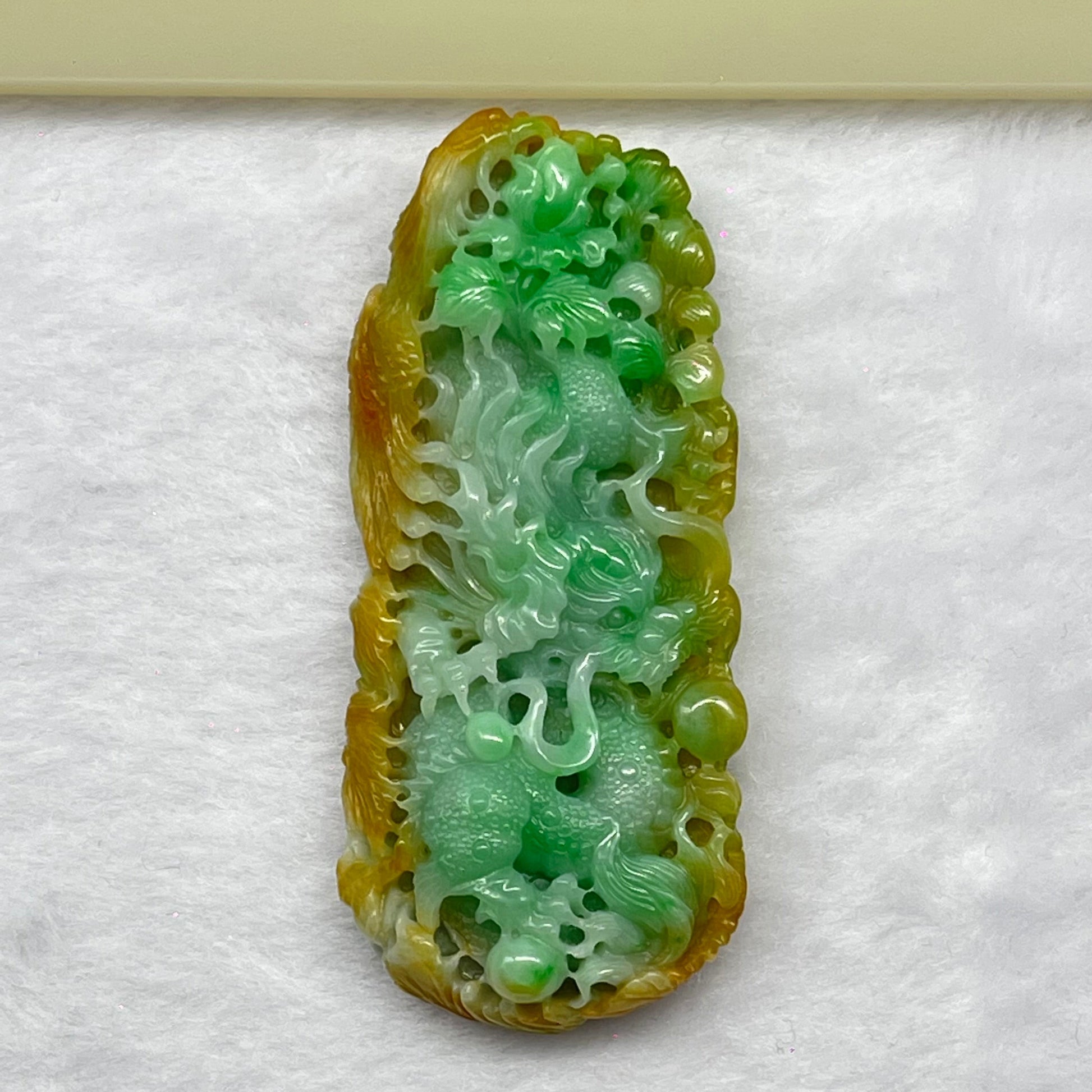 High Quality Type A Spicy Green with Yellow Piao Hua Jadeite Dragon Phoenix and Flower Pendant 55.16g 80.6 by 35.9 by 13.9mm
