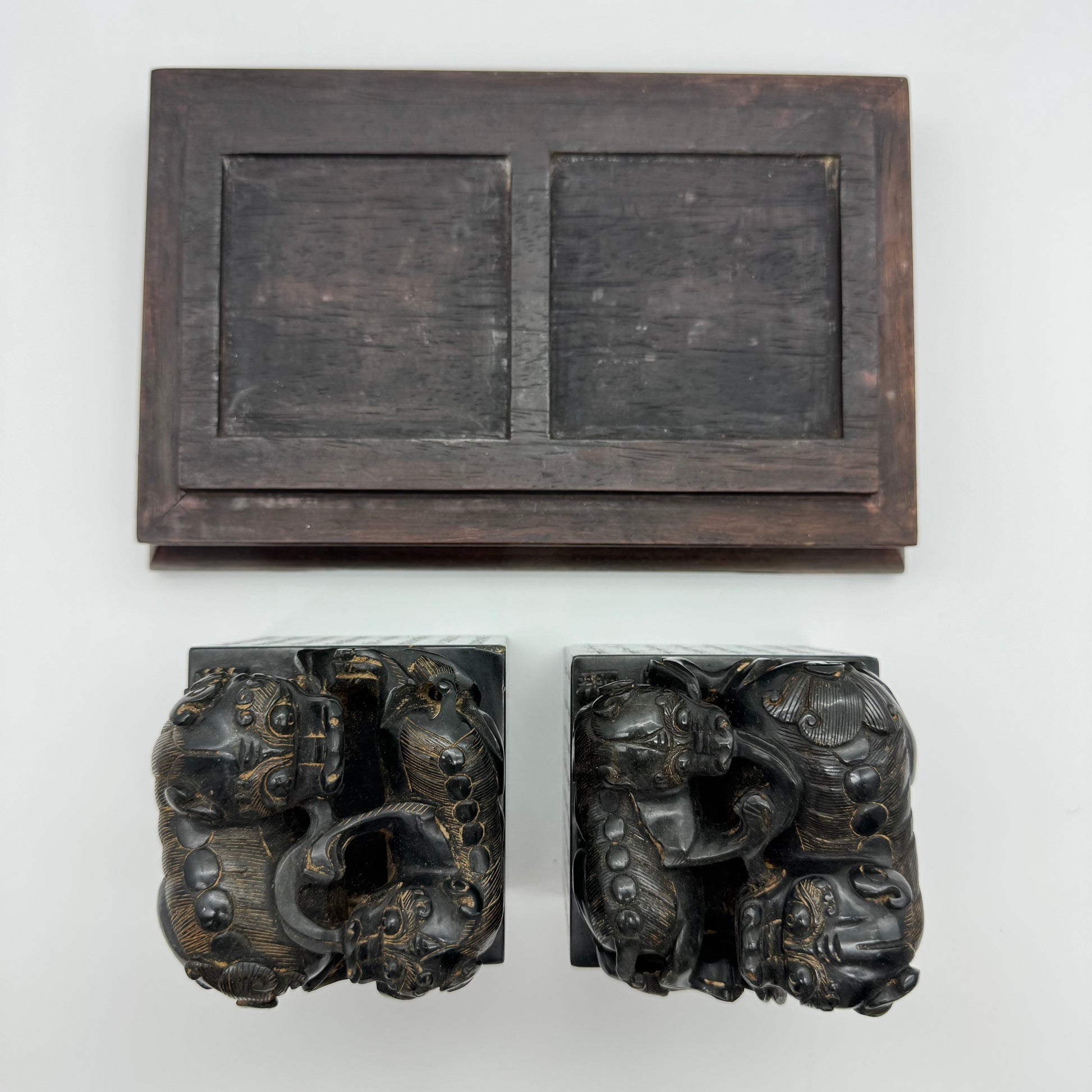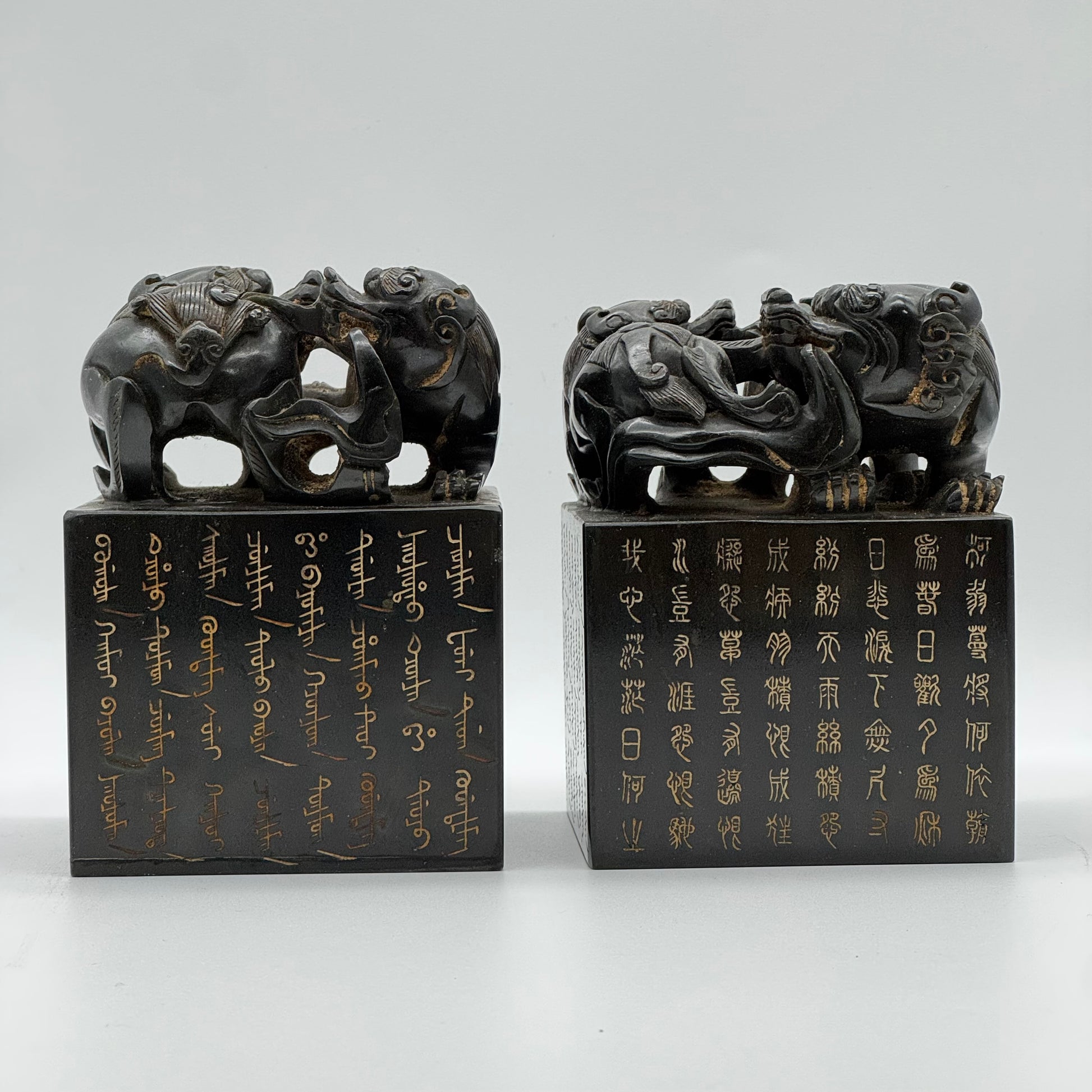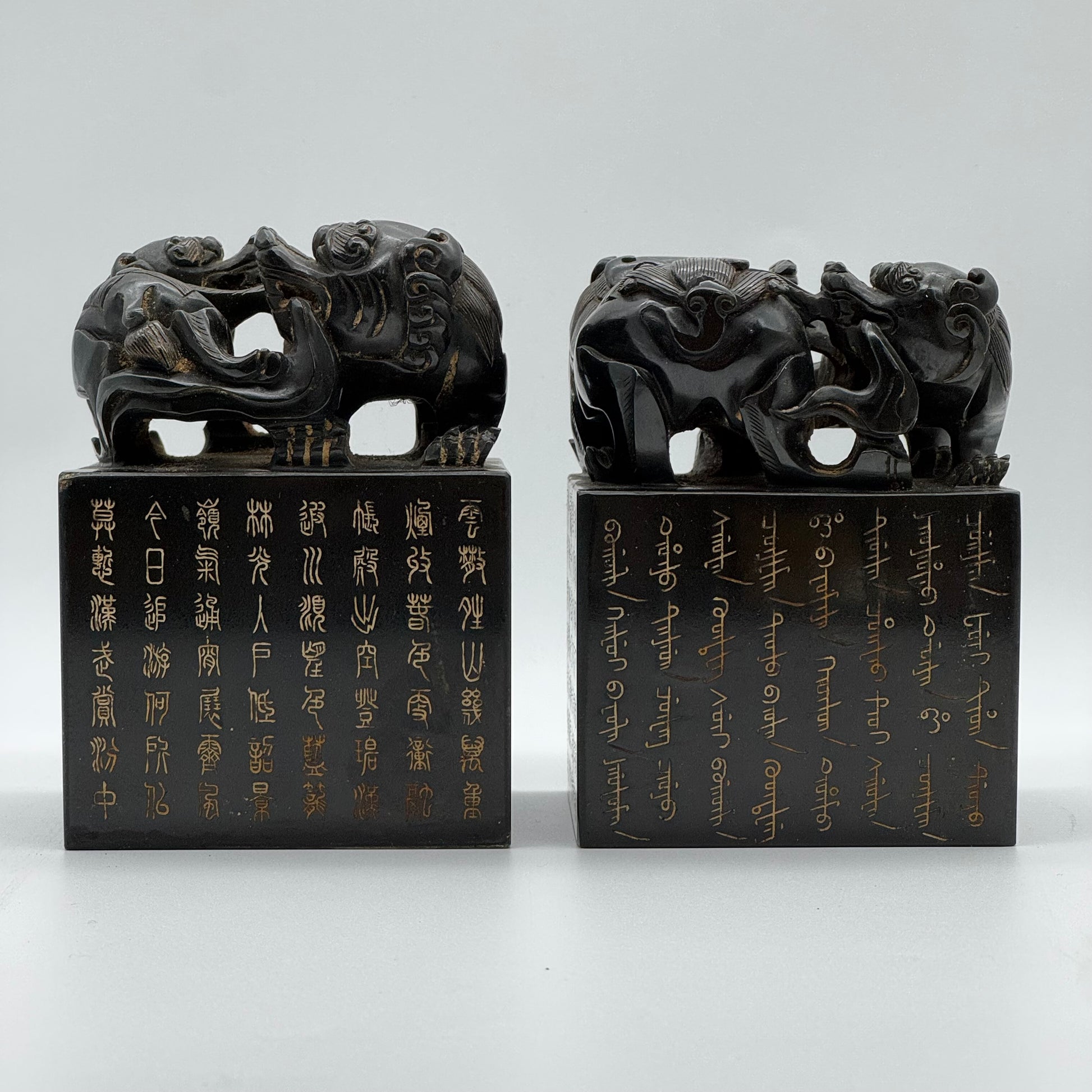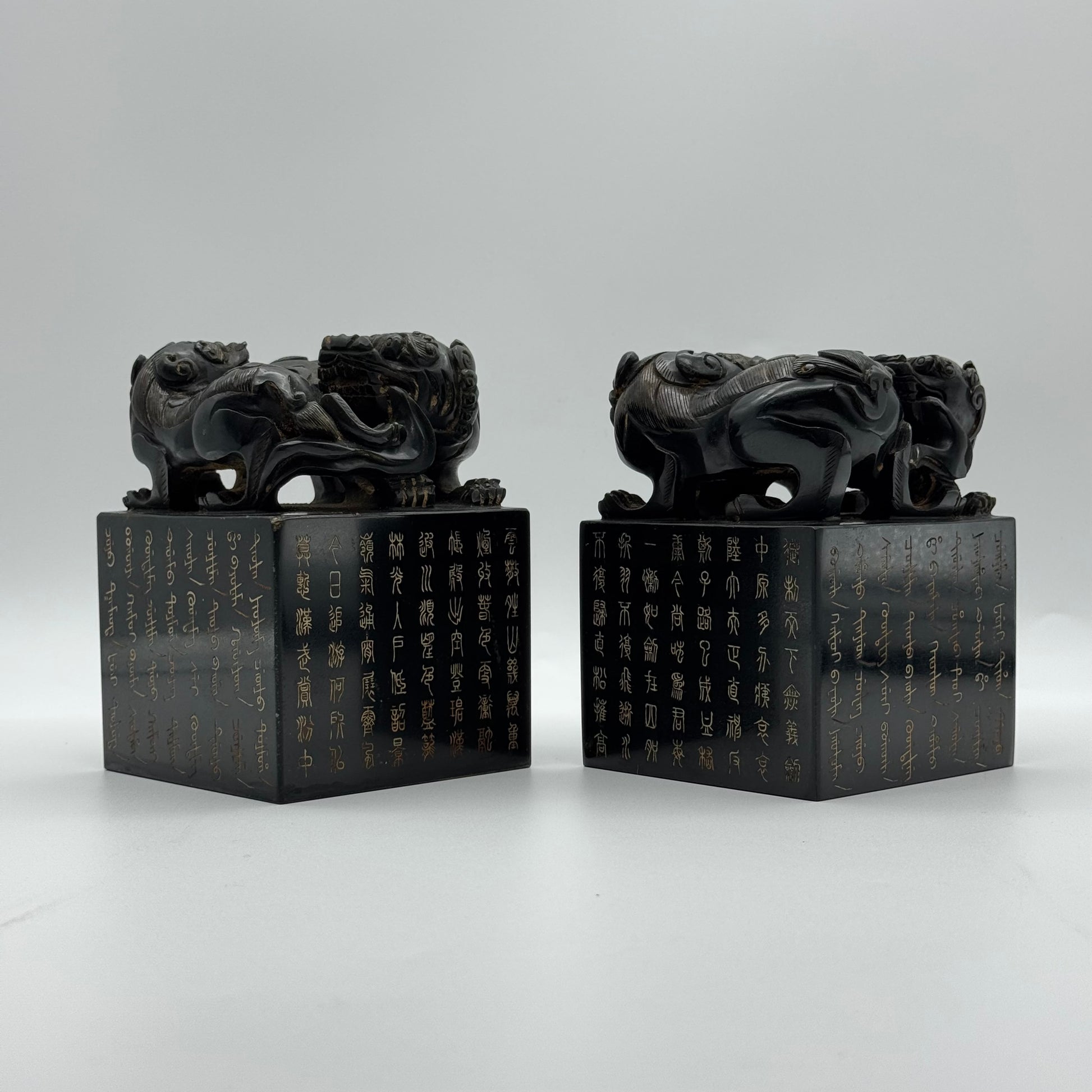 Rare Antique Natural Dark Green Nephrite Seal Pair of Twin Double Pixiu Stamp 5,596.2g 86.4 by 86.9 by 120.2mm with Wooden Box 355.0 by 165.0 by 190.0mm