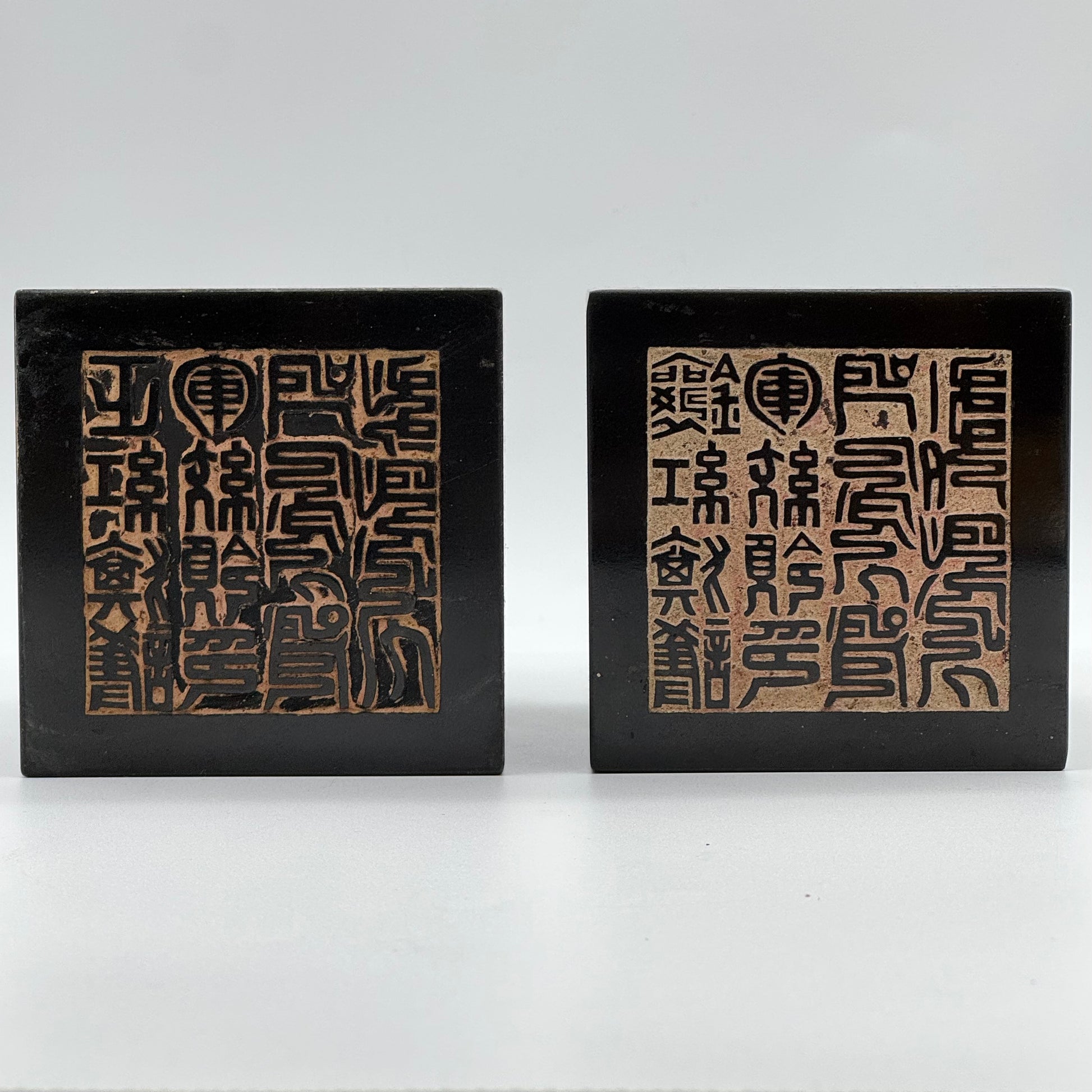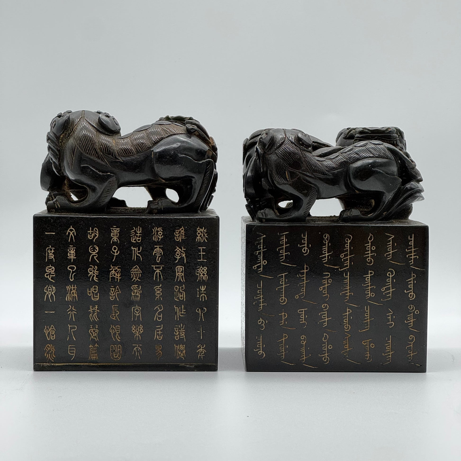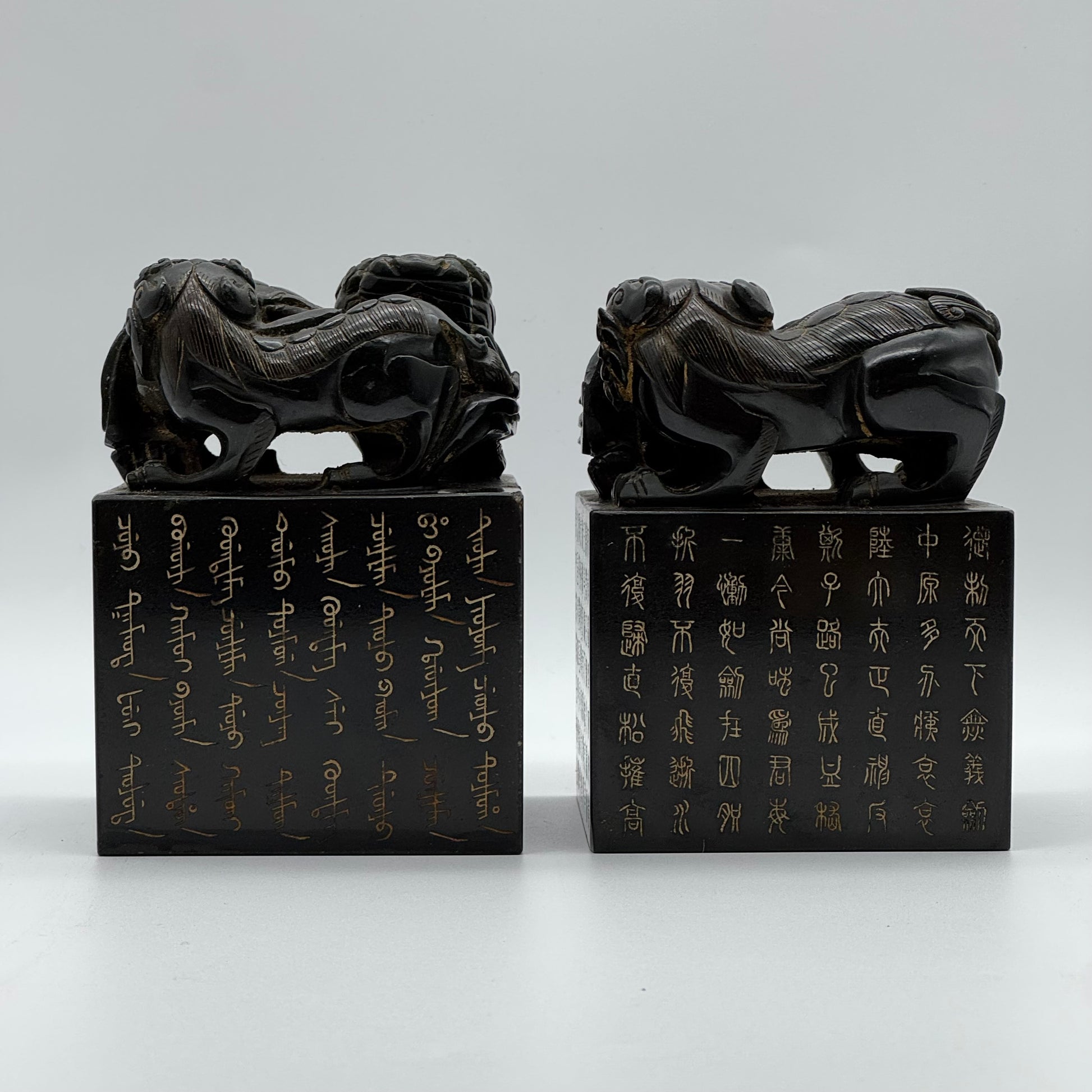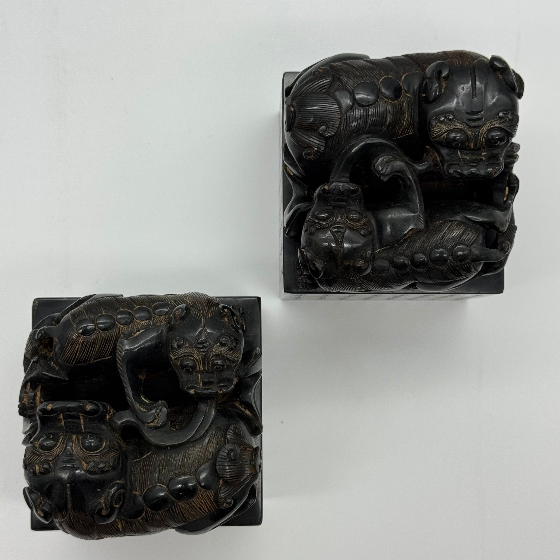 Rare Antique Natural Dark Green Nephrite Seal Pair of Twin Double Pixiu Stamp 5,596.2g 86.4 by 86.9 by 120.2mm with Wooden Box 355.0 by 165.0 by 190.0mm