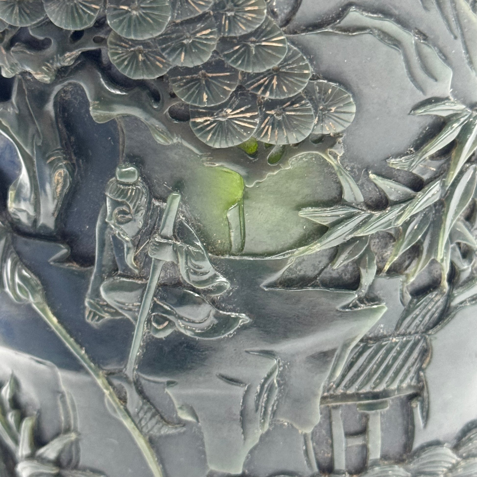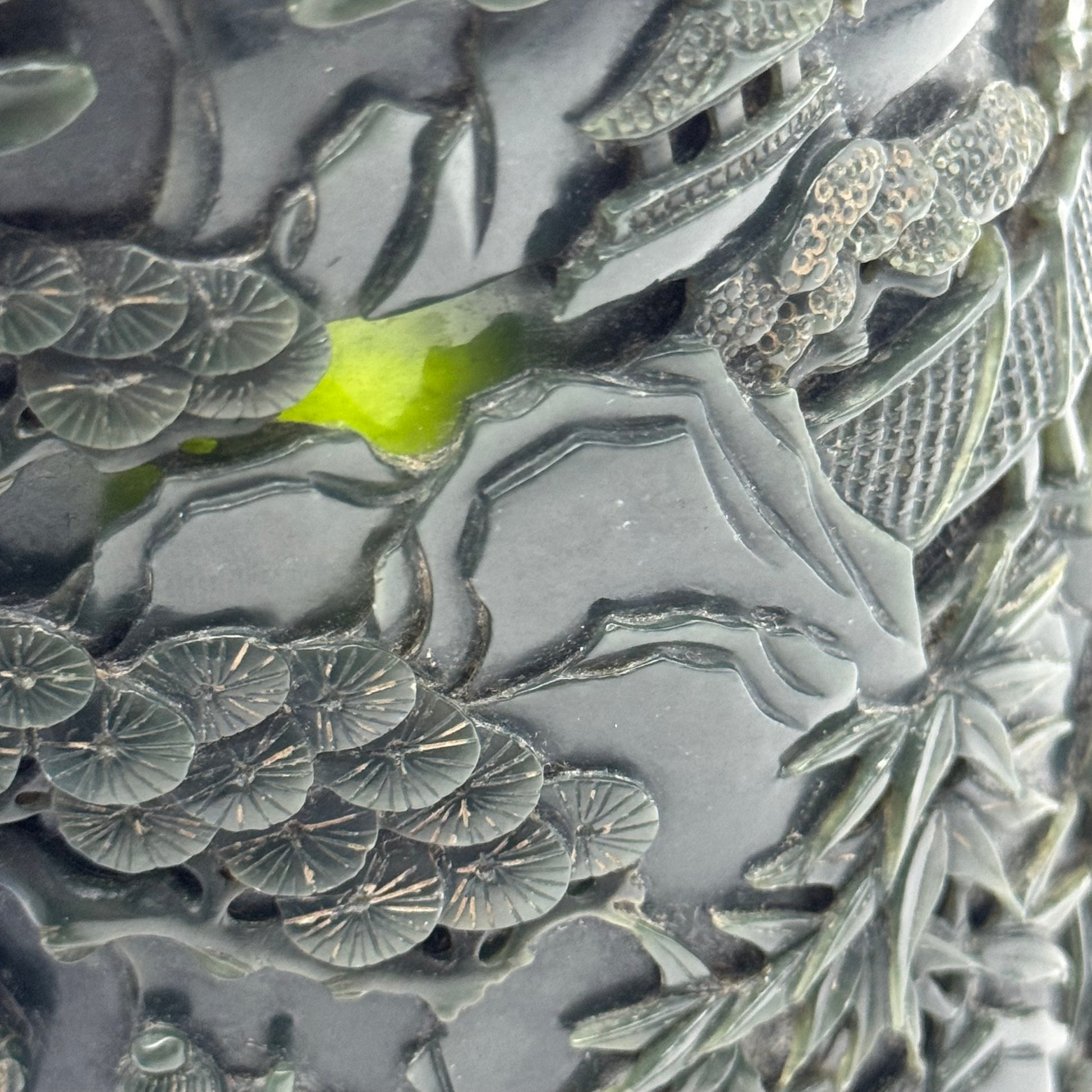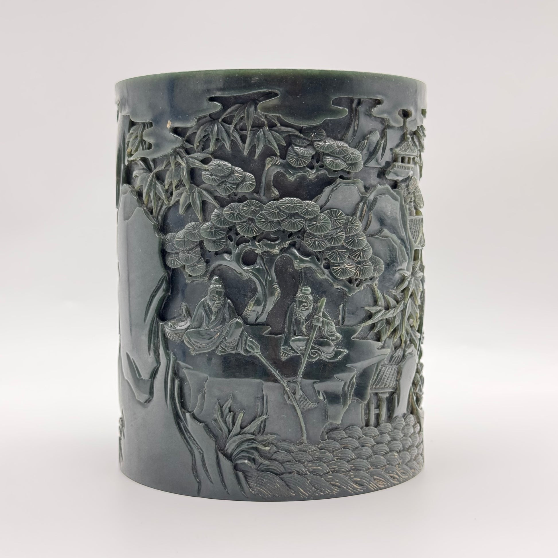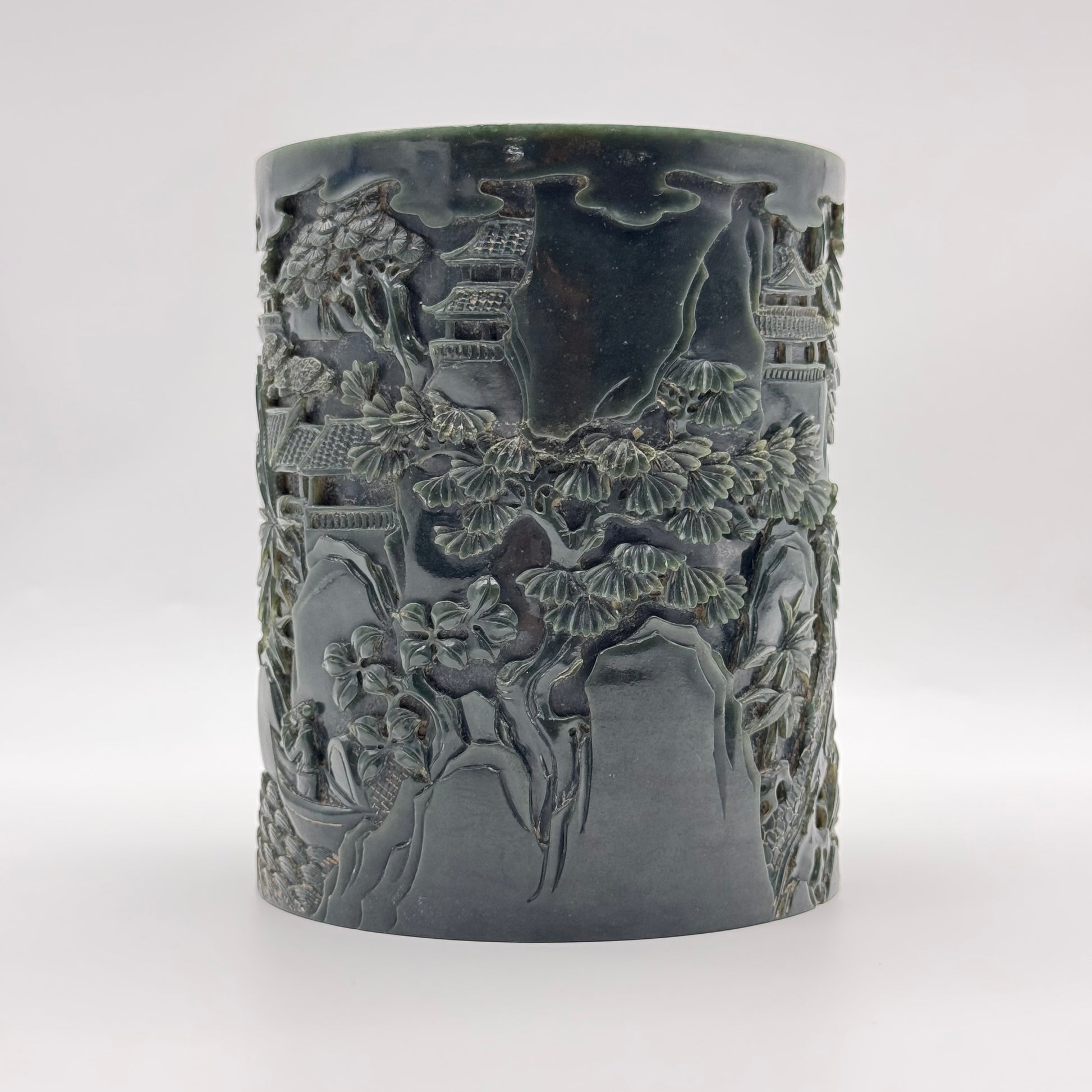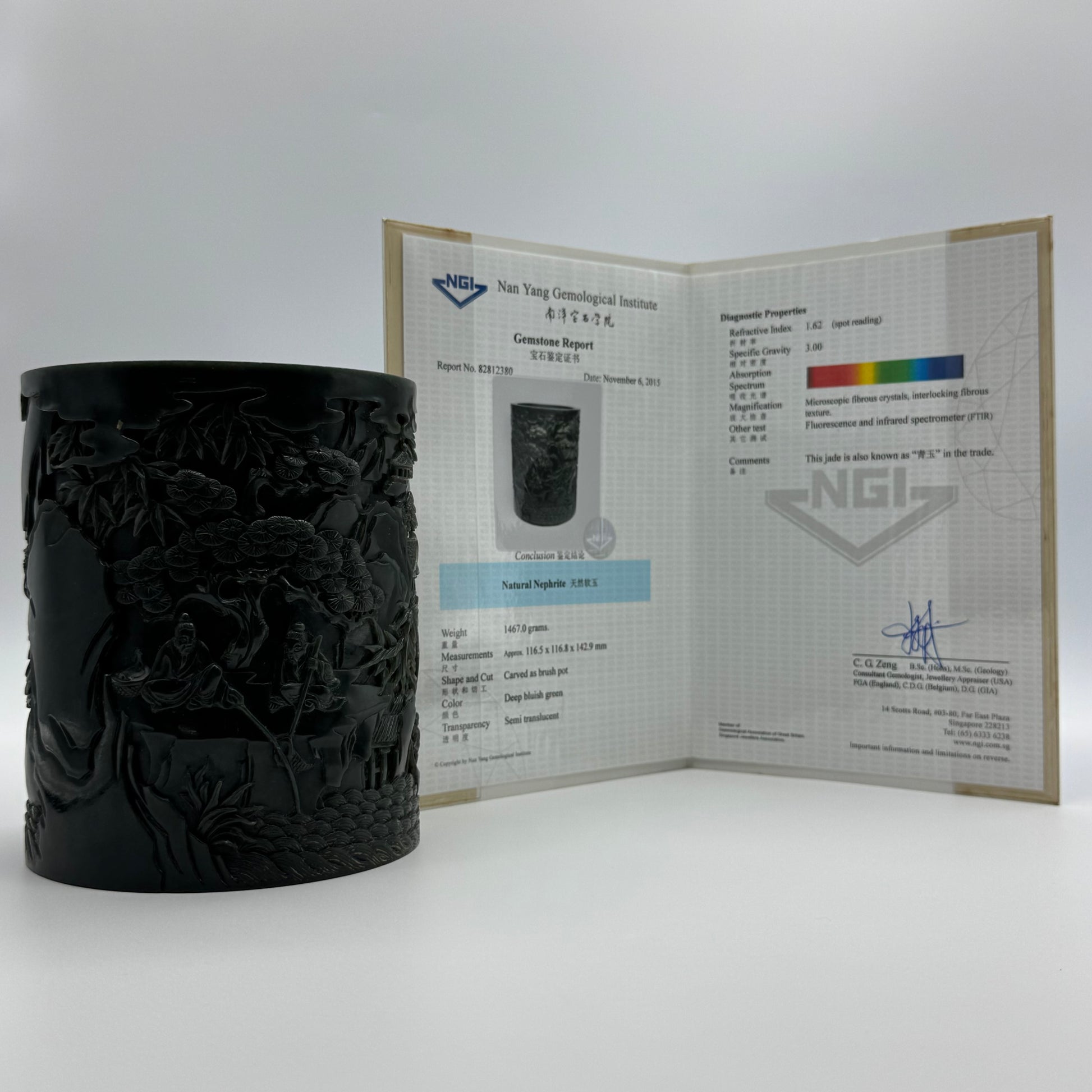 Rare Antique Natural Dark Green Nephrite Shan Shui Brush Pot with Gui Ren Display 1,467.0g 116.5 by 116.8 by 142.9mm with NGI Cert 82812380