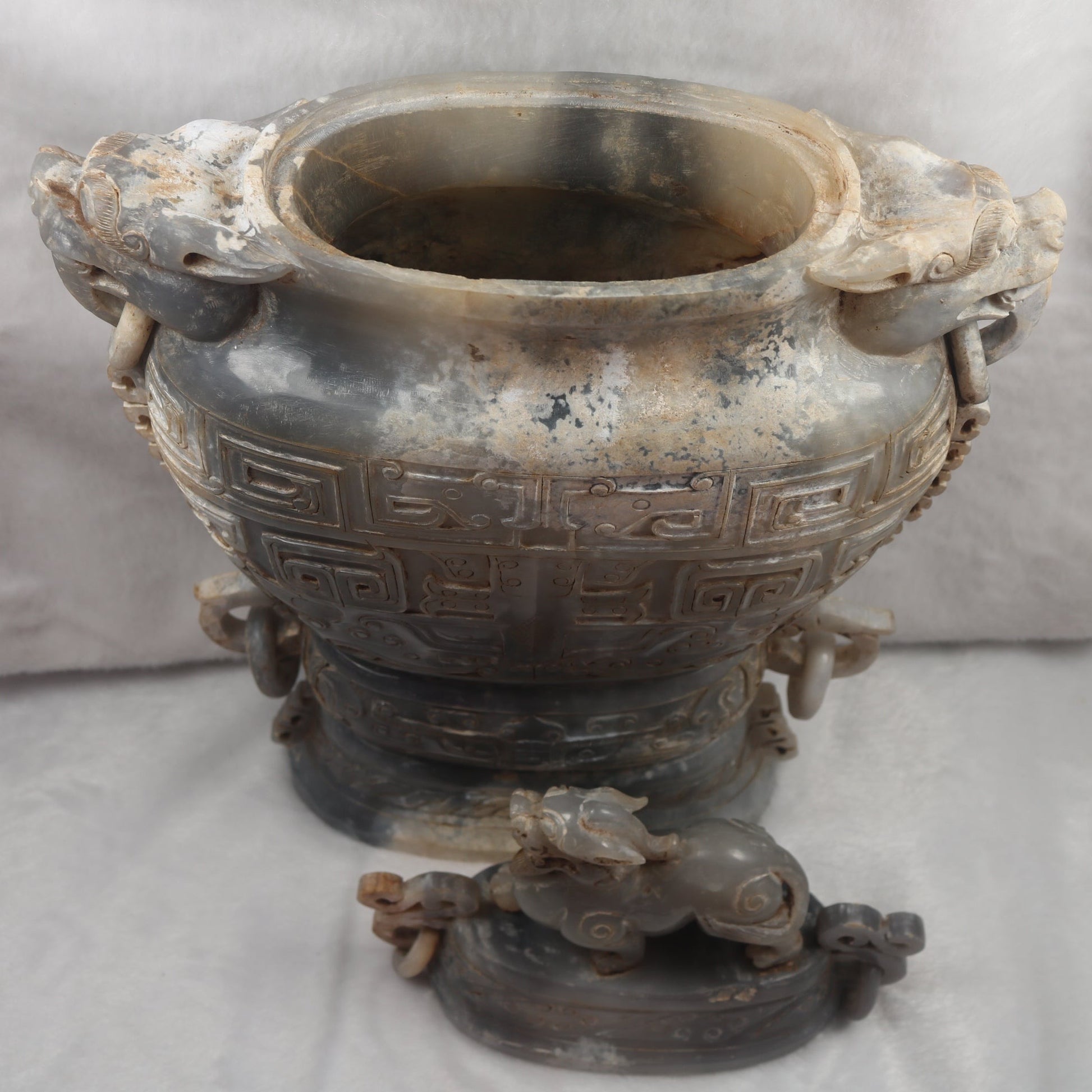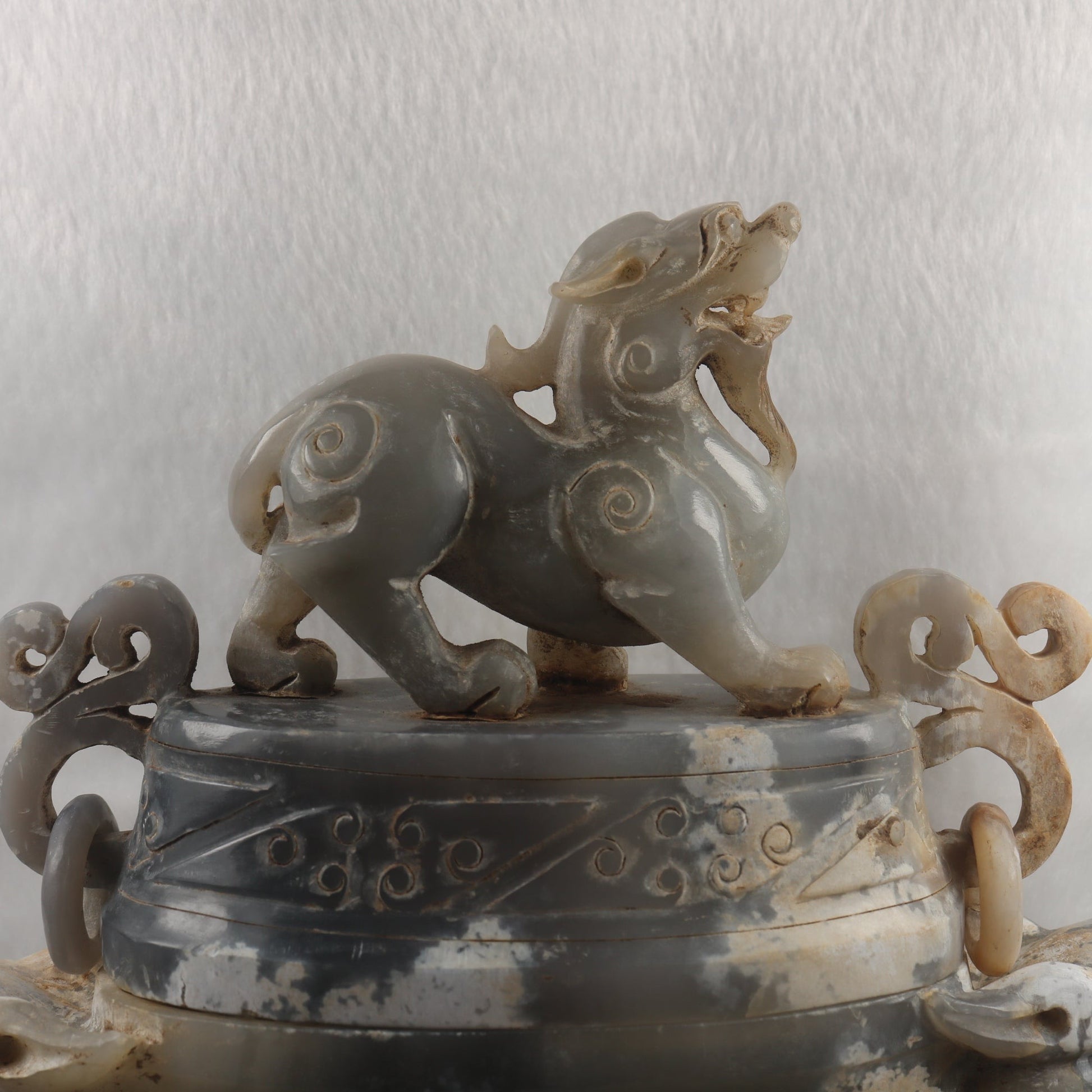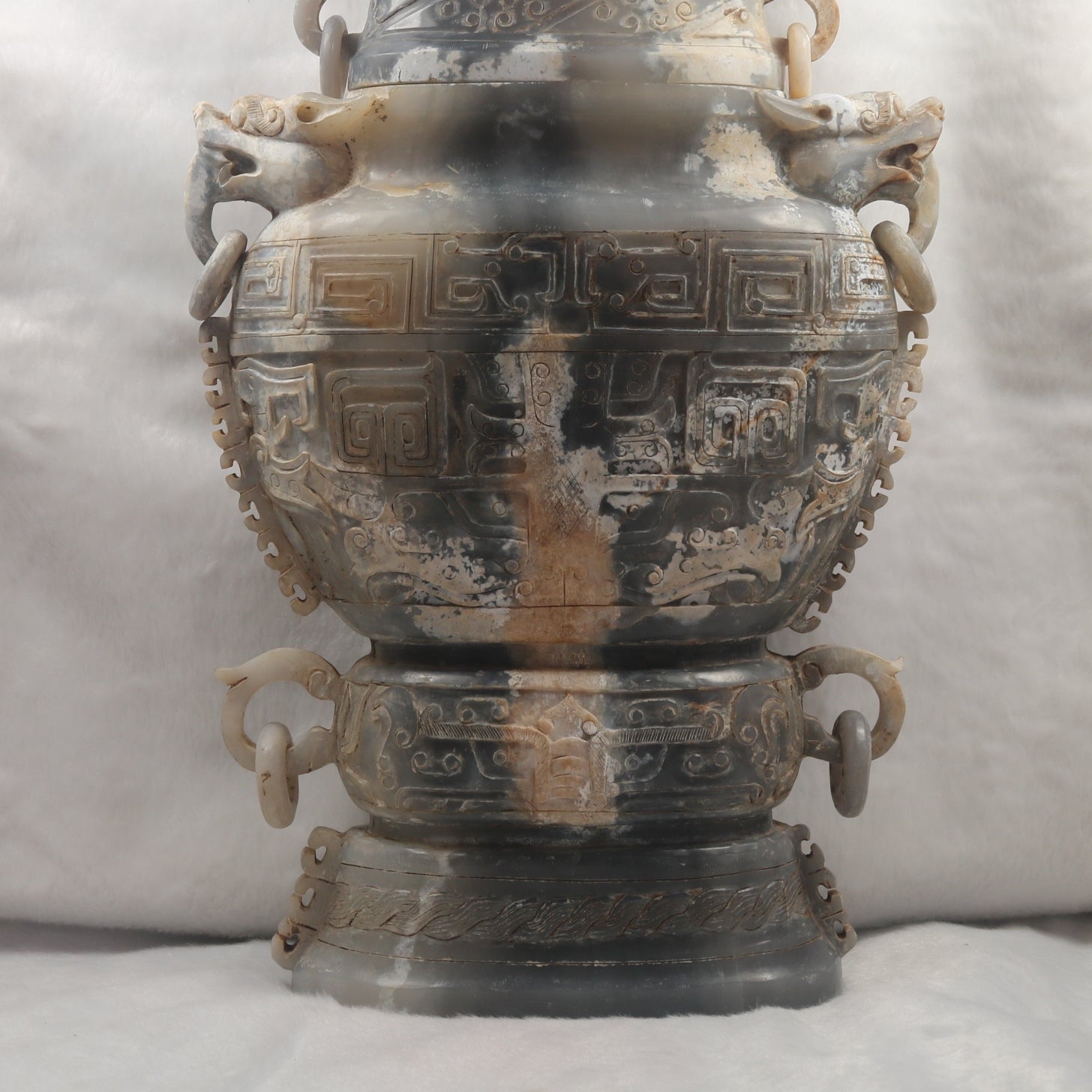 Rare Antique Natural Grey with Pink and White Patches Nephrite Vase with Pixiu Display 3.832,6g 220.0 by 90.0 by 370.0mm