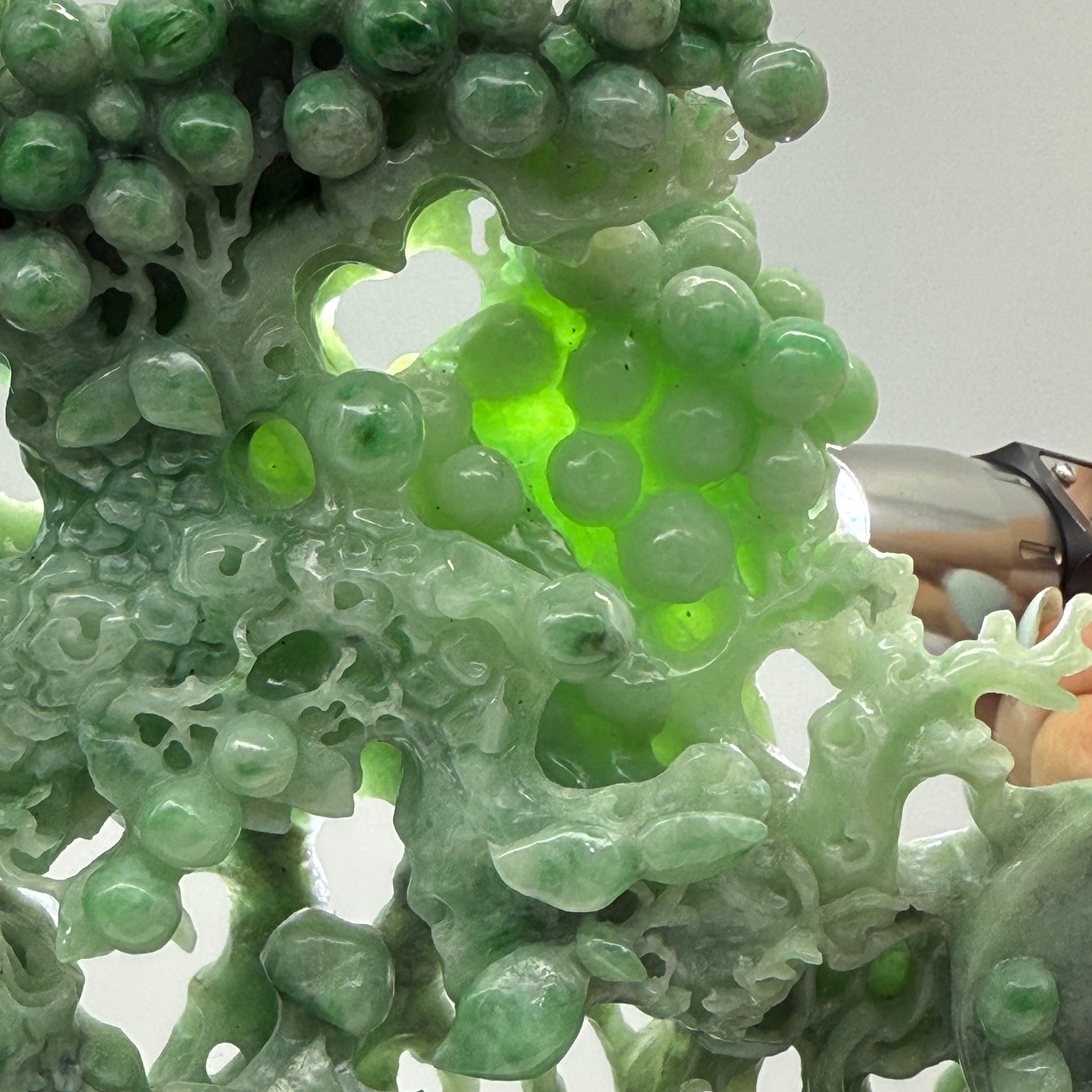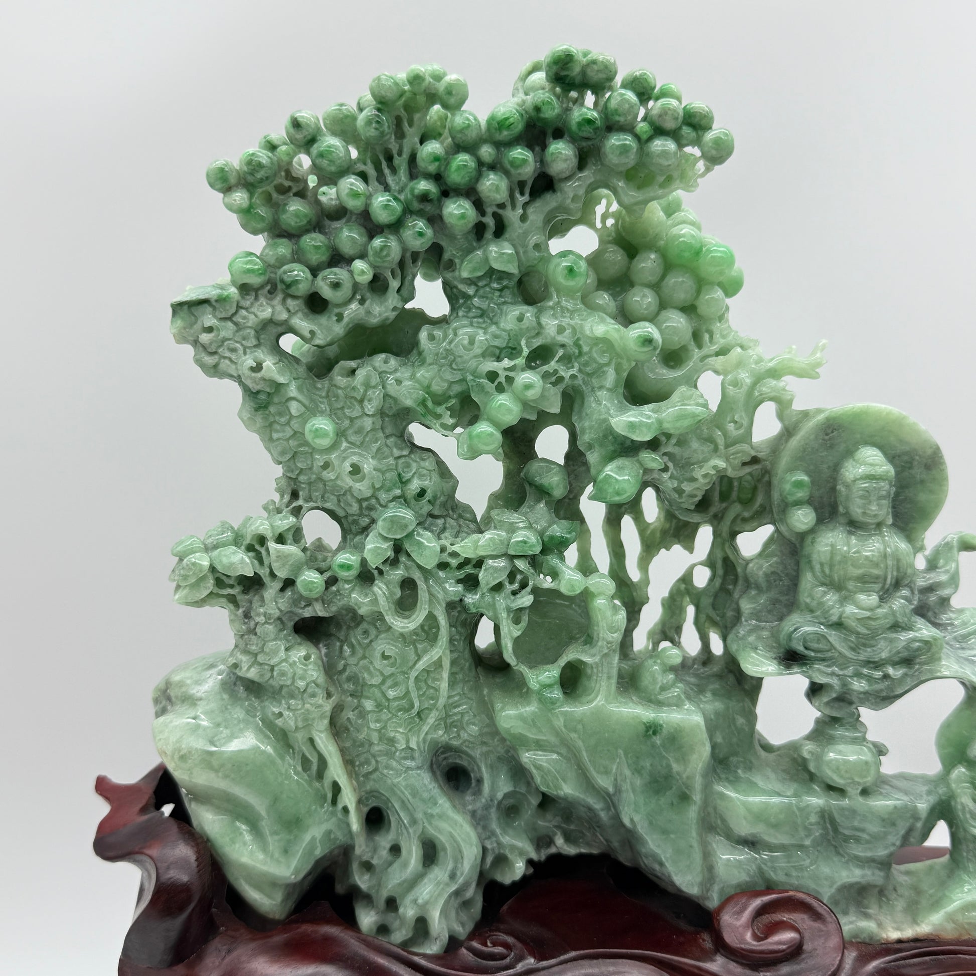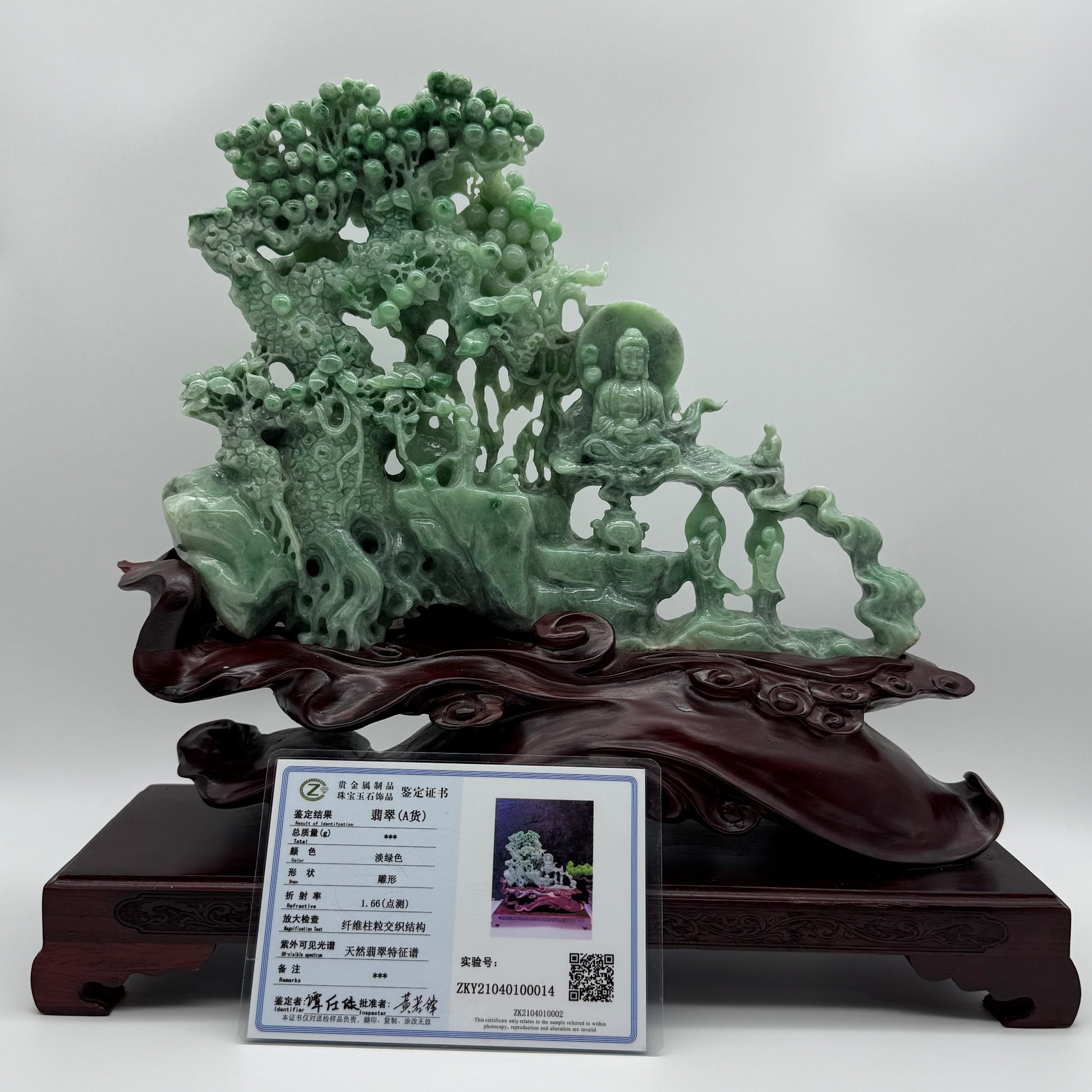 Rare Full Apple Green Buddha & Disciple Shan Shui Display 2,490g 300.0 by 230.0mm by 60.0mm with wooden stand 2,345g Total 4,835g 350.0 by 350.0 by 120.0mm