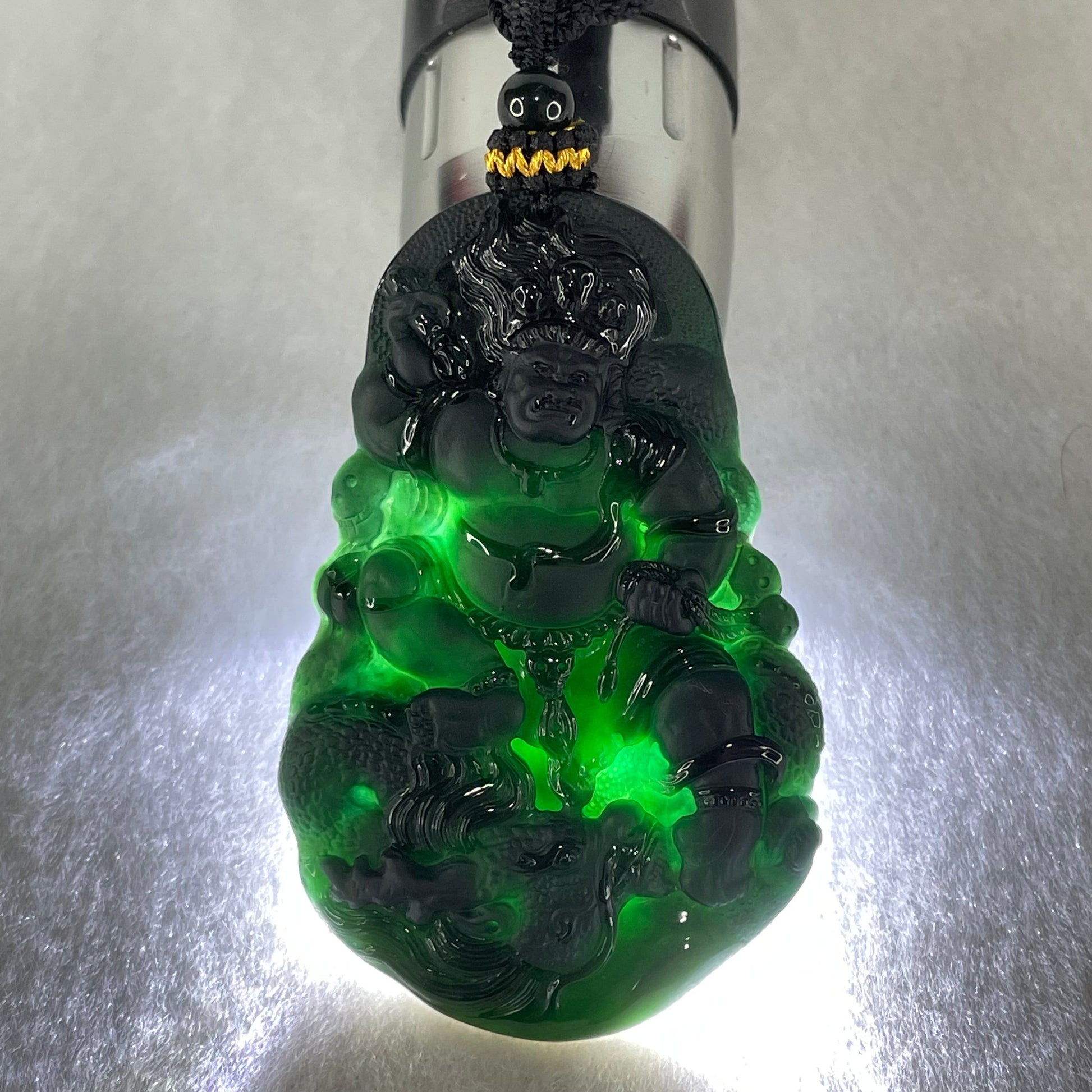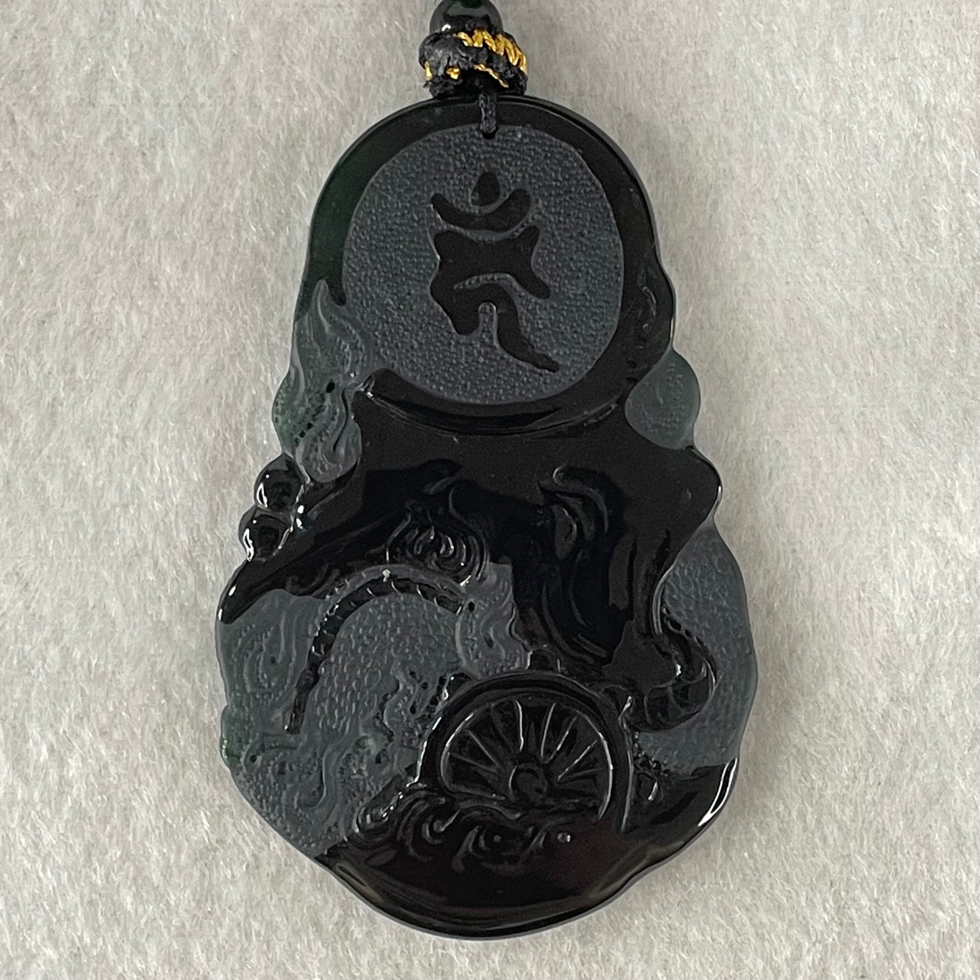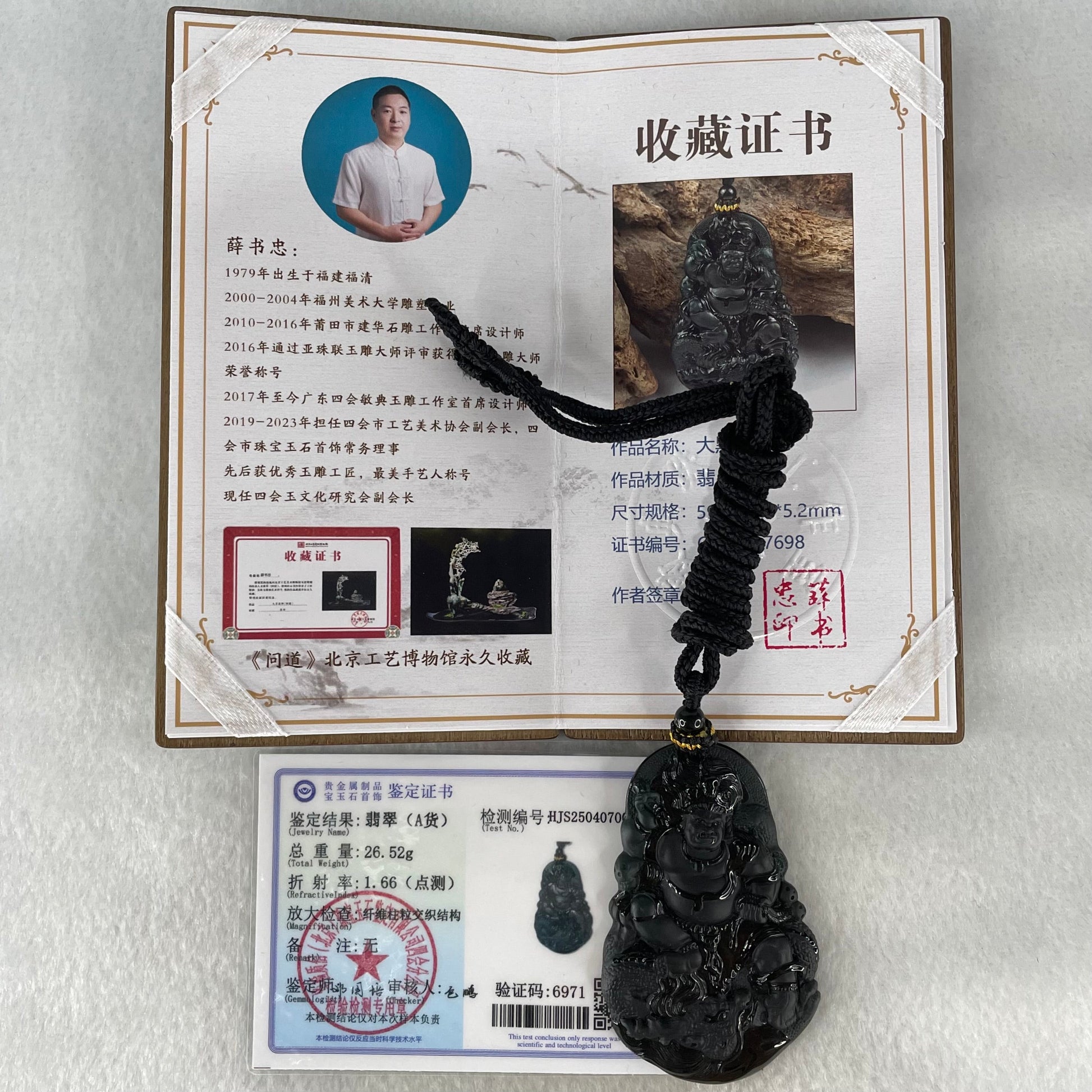 Rare Grand Master Type A Fully Translucent Black Omphacite Jadeite Da Hei Tian Daikokuten God of Fortune 大黑天 Pendant 26.52g 59.4 by 38.7 by 5.2mm