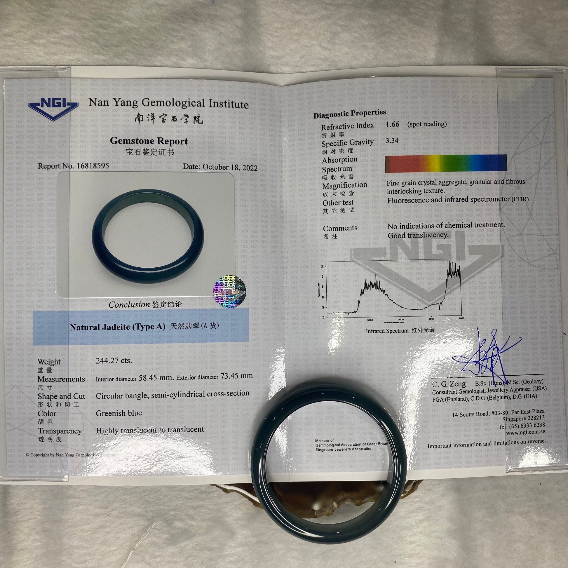 Rare High End ICY Type A Blueish Green Jadeite Bangle 244.27 cts Inner Dia 58.45mm 11.8 by 7.9mm with NGI Cert