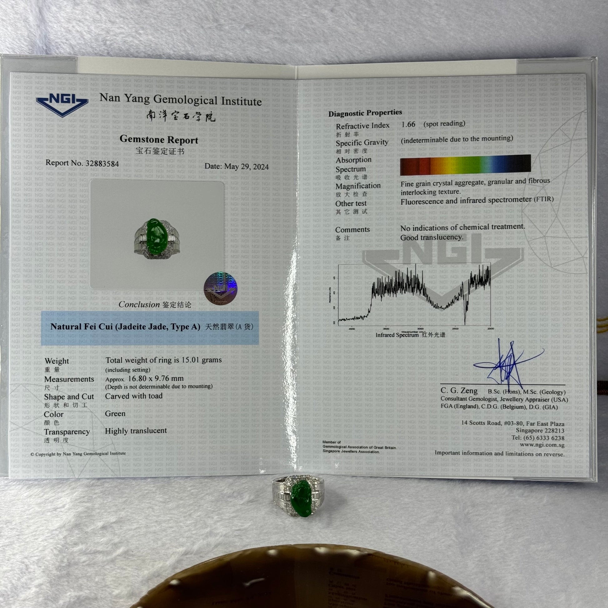 Rare Type A Burmese High End Jade Jadeite Chan Chu aka 3 Legged Frog Ring 18K White Gold & Diamonds - 14.99g US9.45 HK22 with NGI Cert