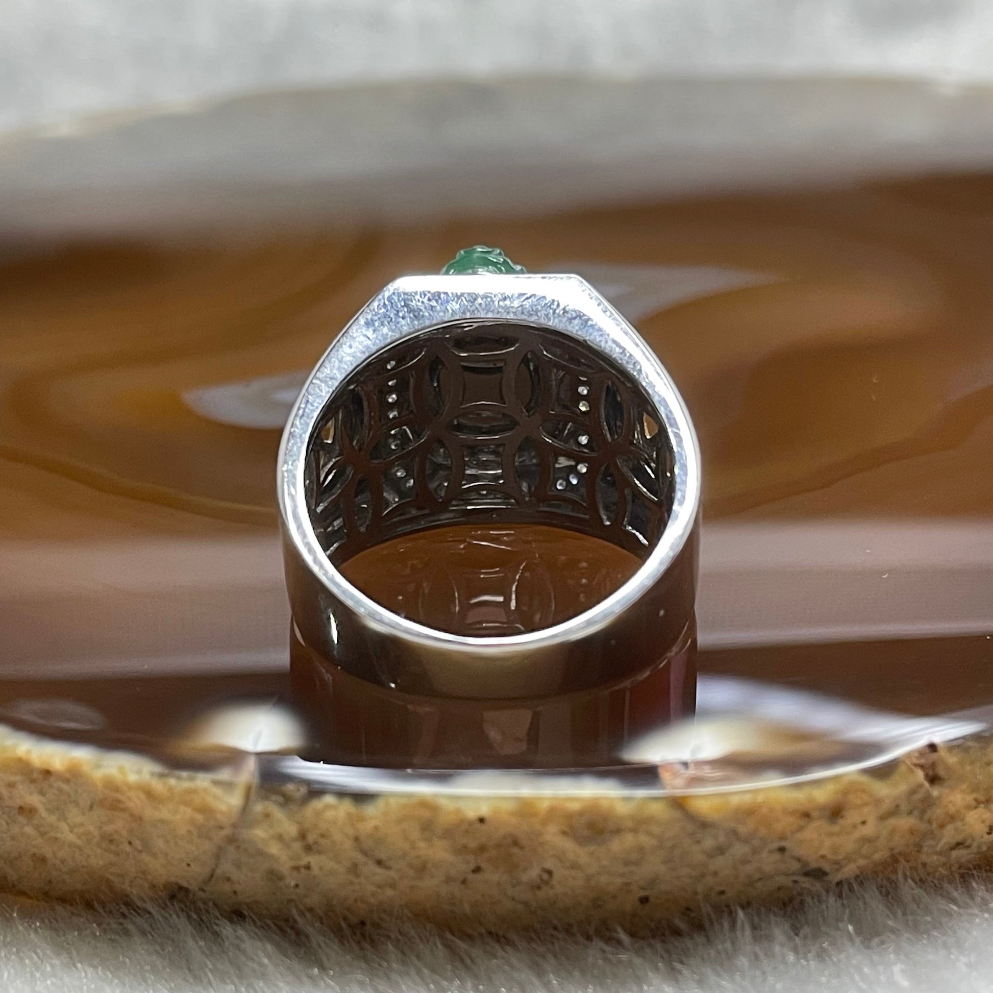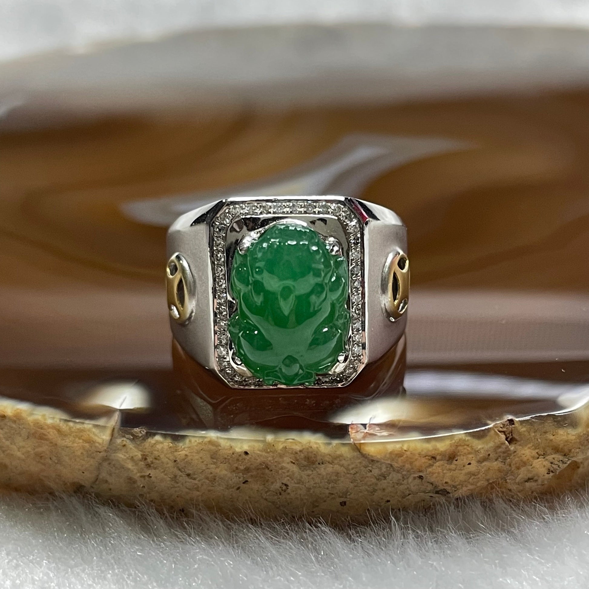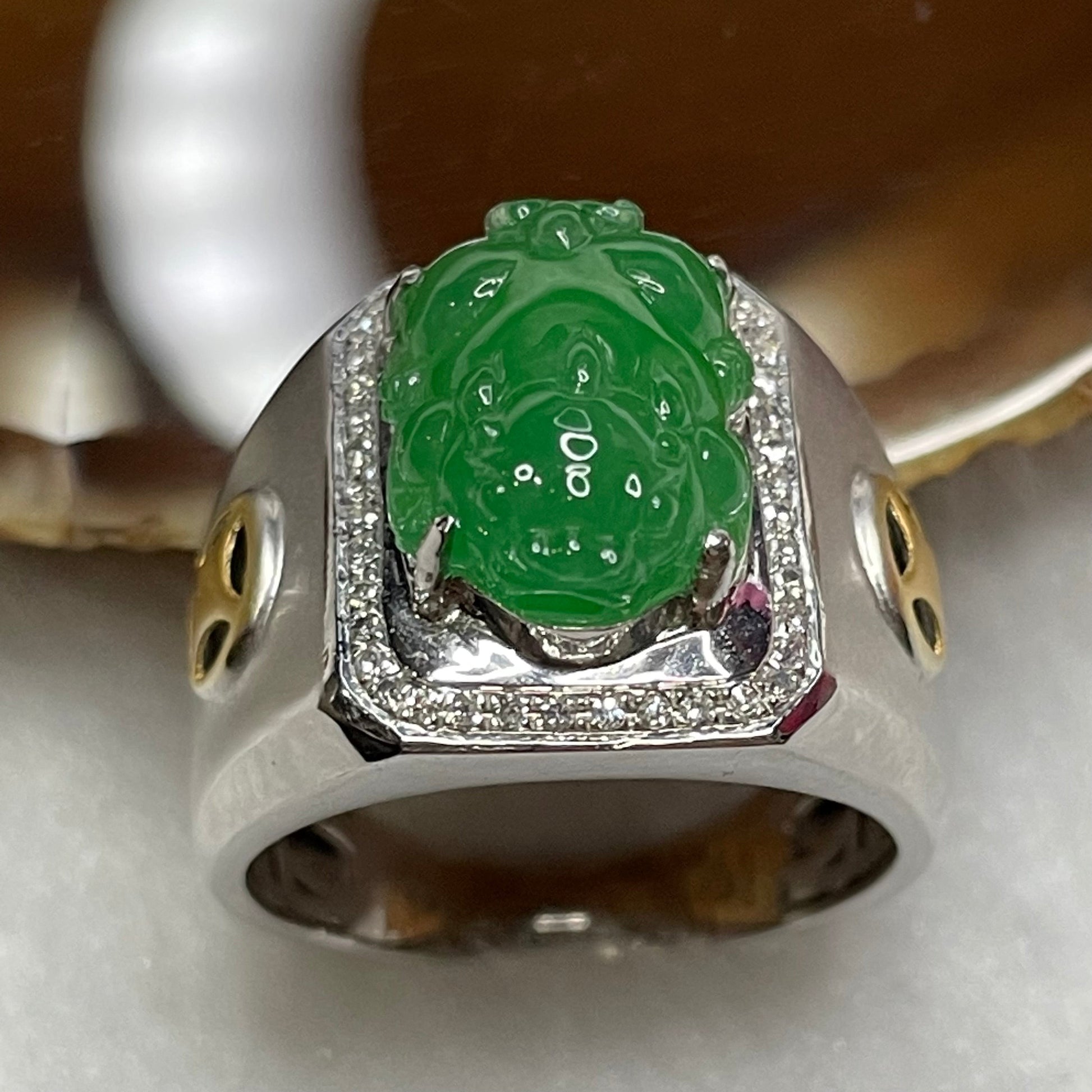 Rare Type A High Quality Yang Green Pixiu Jade Jadeite 18k white gold & Natural Diamonds 7.46g 16.3 by 10.2mm US8.5 HK19 with NGI cert