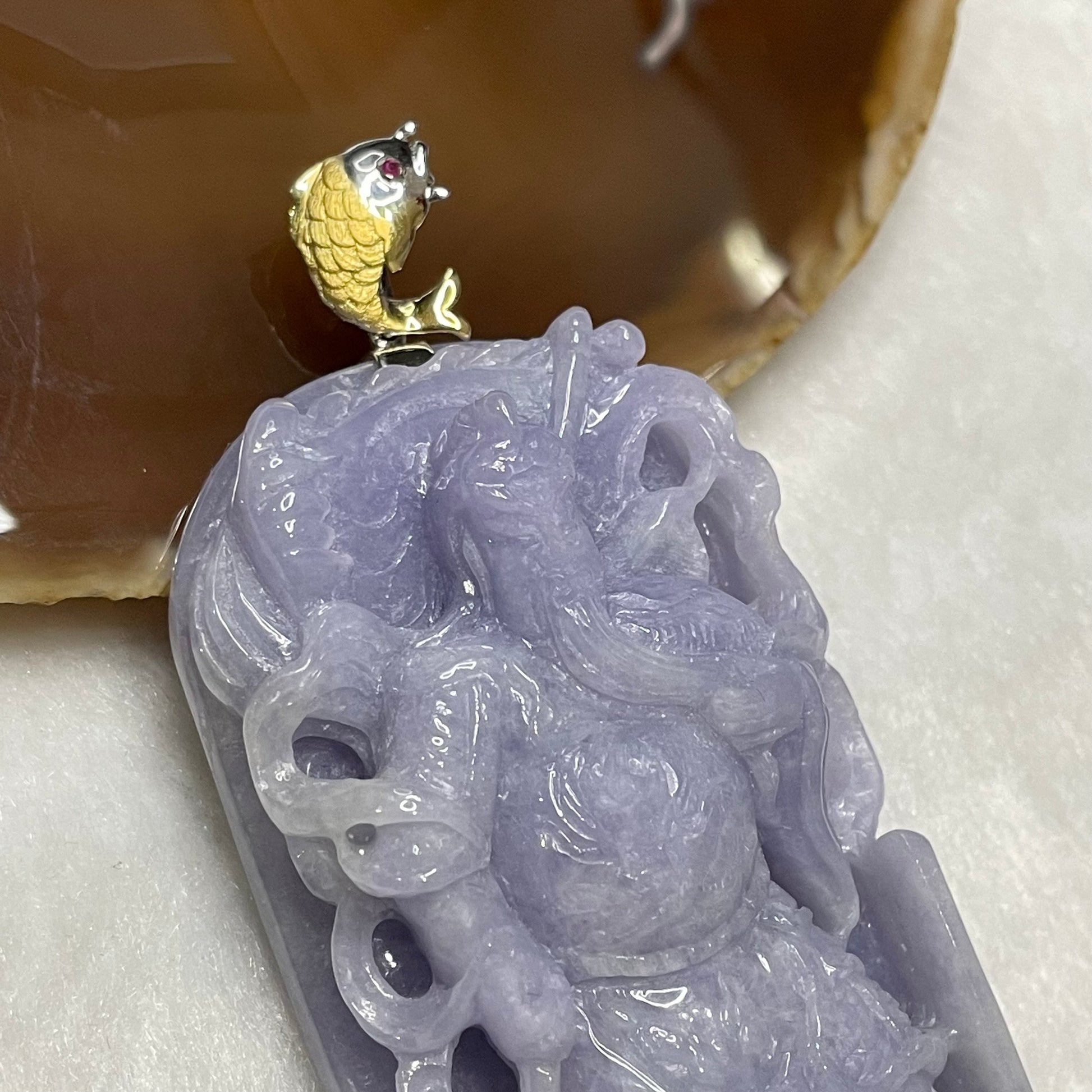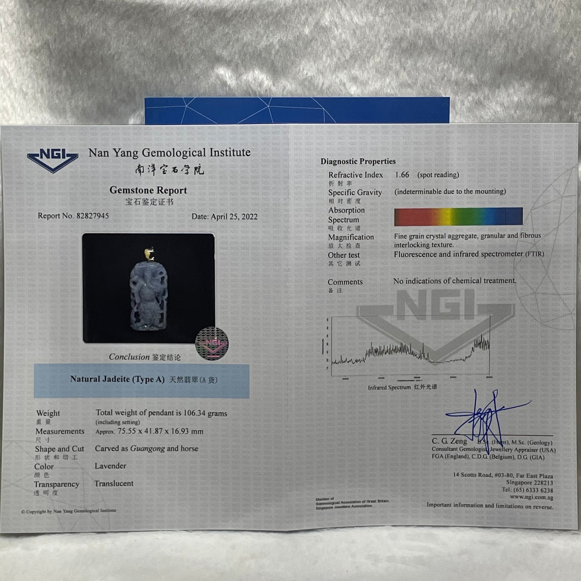 Rare Type A Intense Lavender Guan Gong Jade Jadeite 18k gold with NGI Cert 106.26g 90.0 by 41.3 by 15.8mm