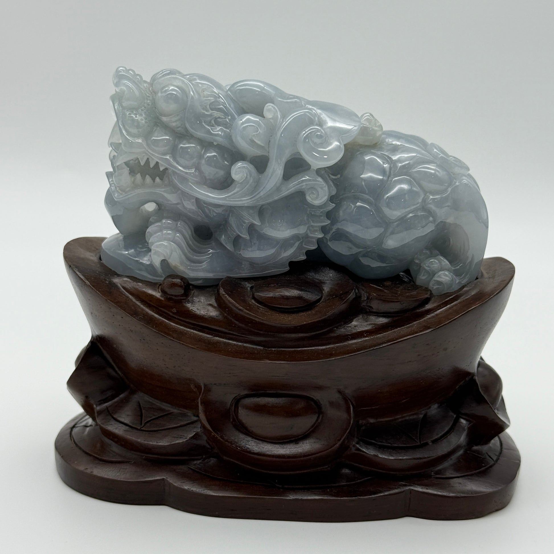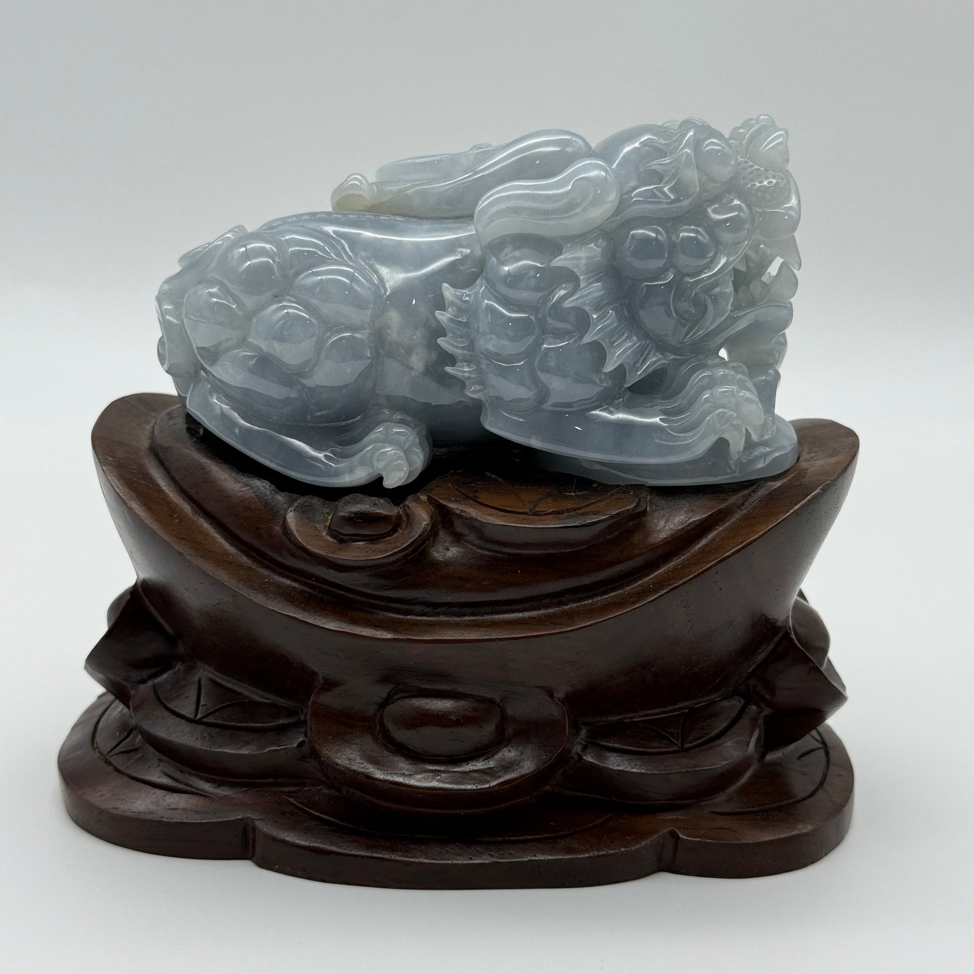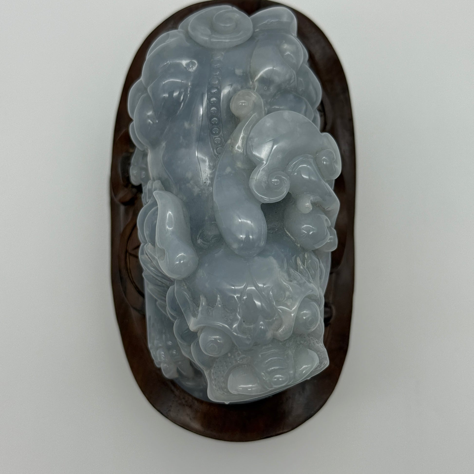 Type A Blueish Lavender Jade Jadeite Pixiu & Ruyi Display with Wooden Stand: Pixiu: 373.1g 93.1 by 43.1 by 43.7mm With Stand: 747.5g 215.4 by 111.5 by 99.6mm