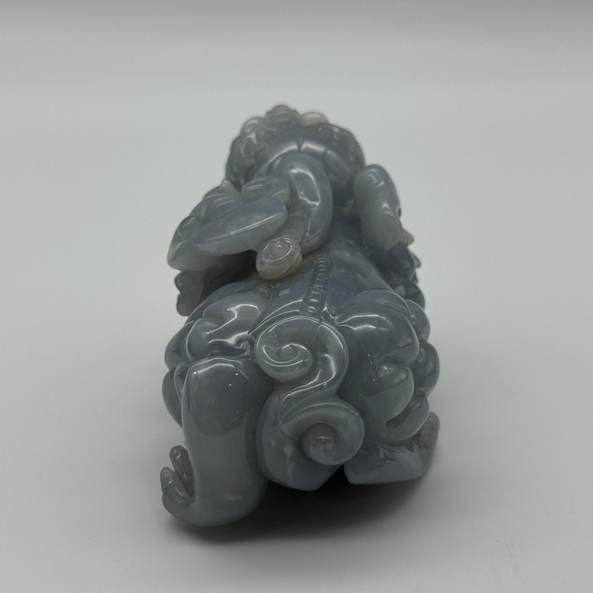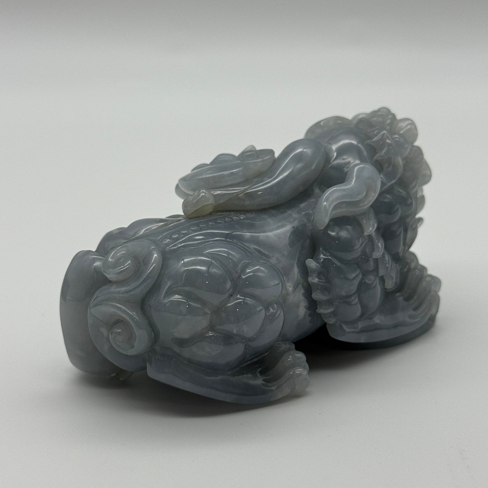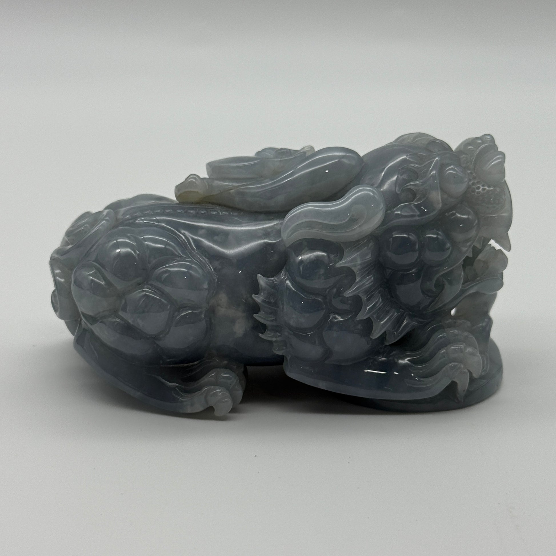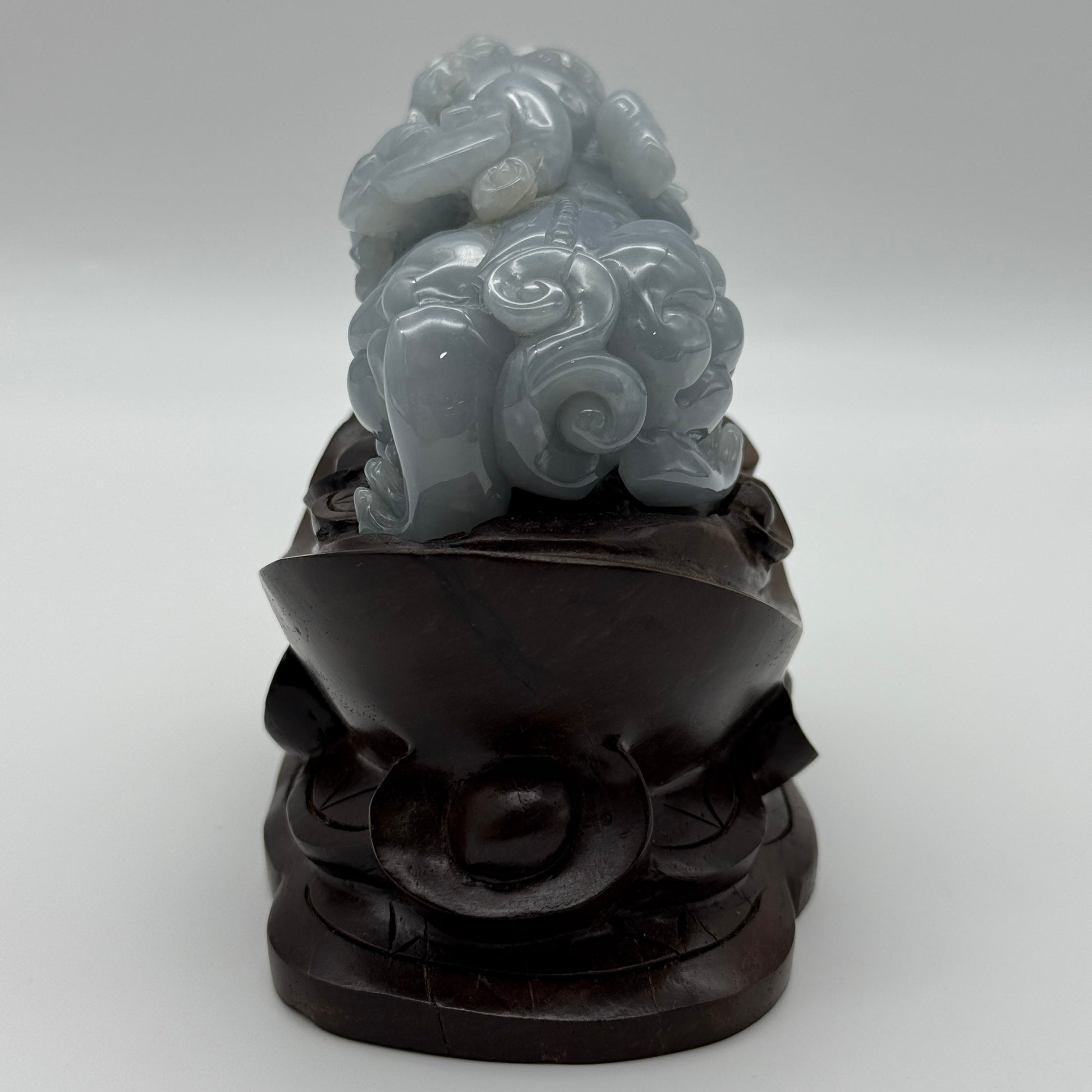 Type A Blueish Lavender Jade Jadeite Pixiu & Ruyi Display with Wooden Stand: Pixiu: 373.1g 93.1 by 43.1 by 43.7mm With Stand: 747.5g 215.4 by 111.5 by 99.6mm