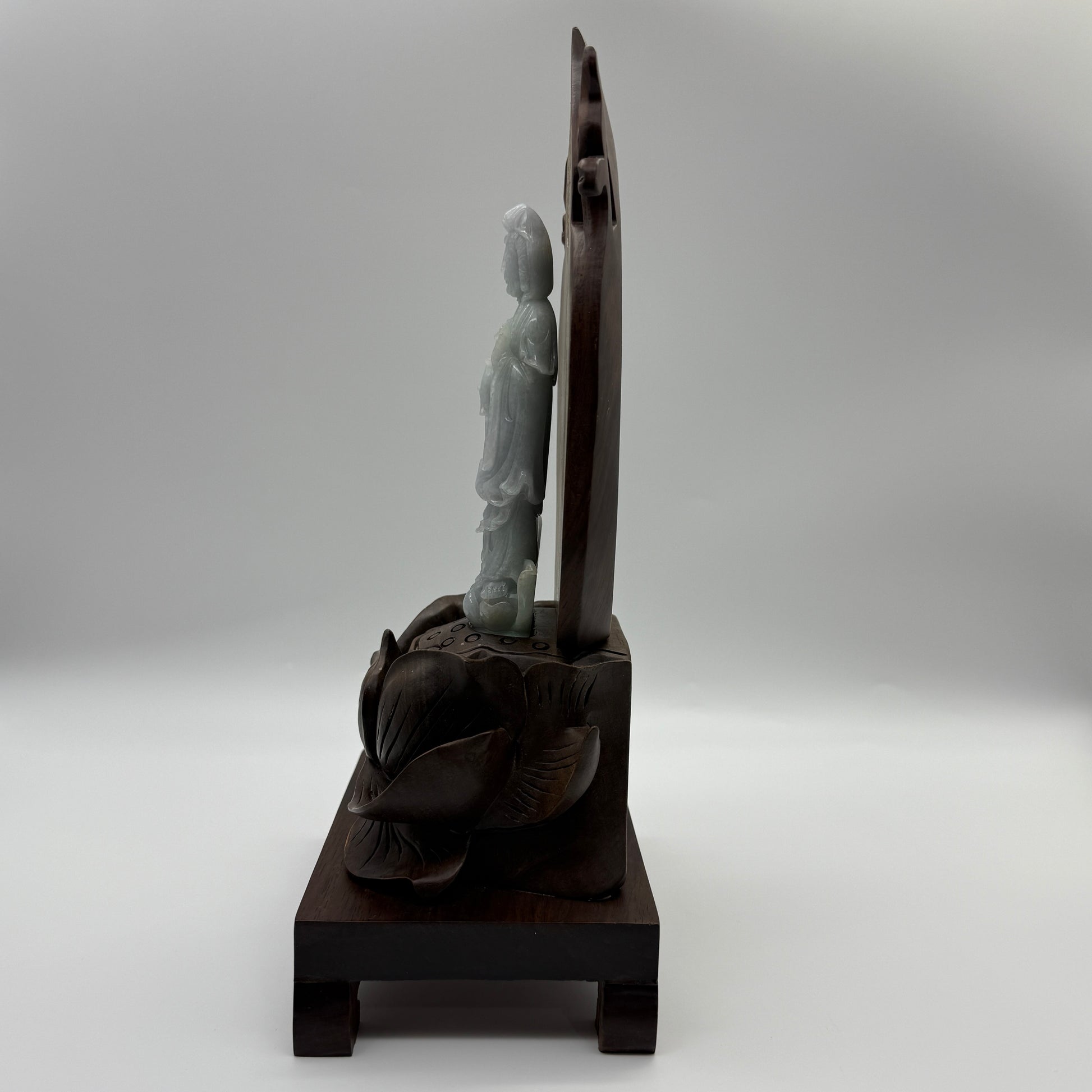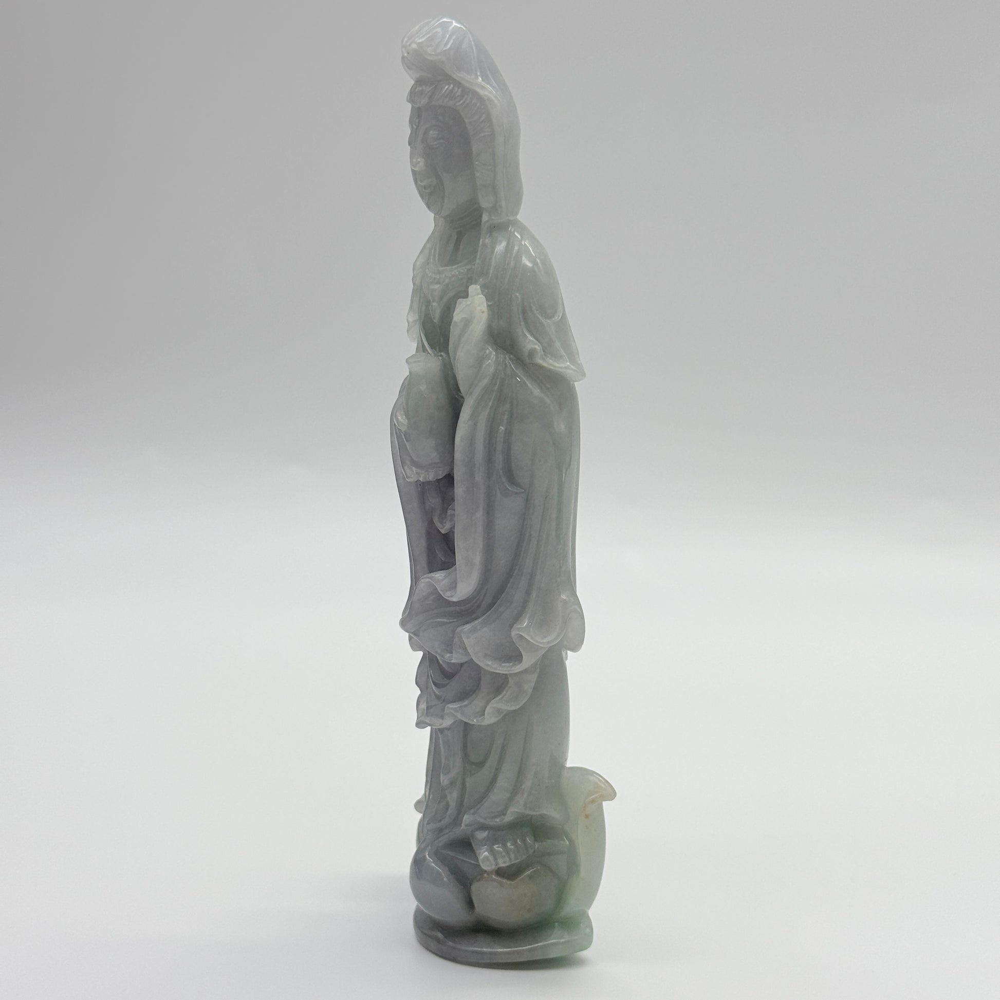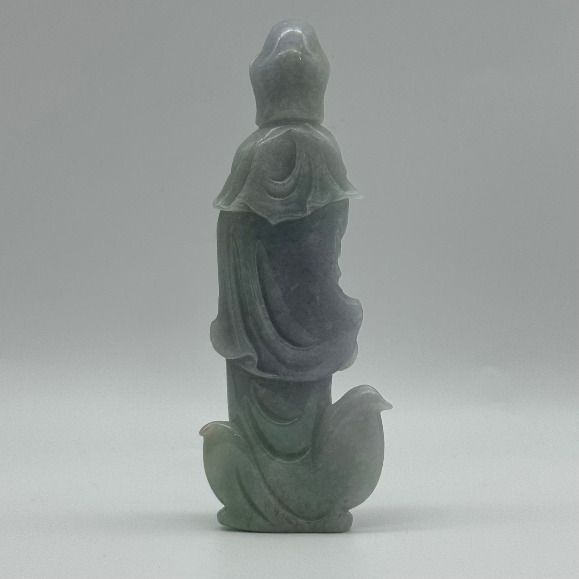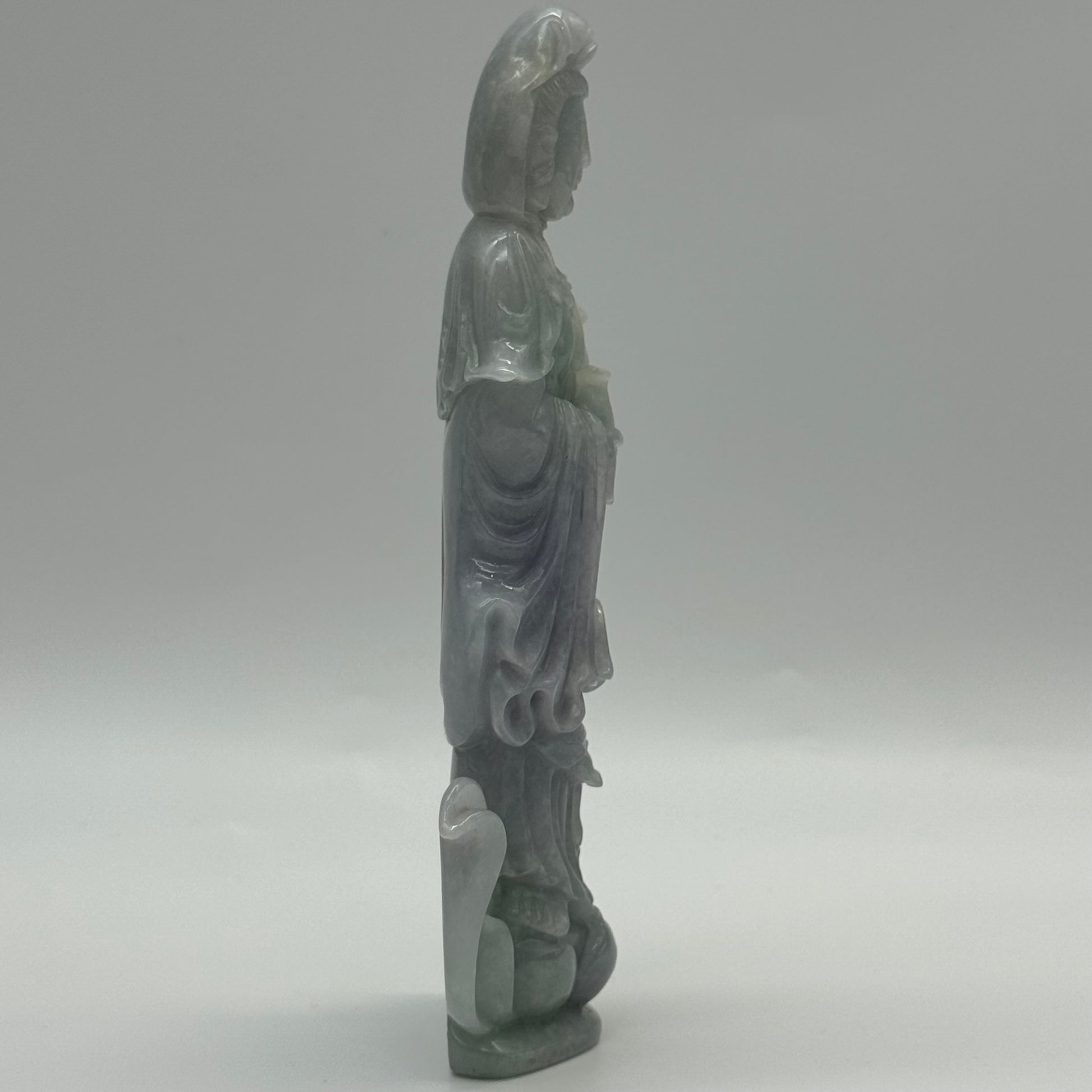 Type A Lavender and Green Jade Jadeite Guan Yin Display 210.5g 142.6 by 53.6 by 24.1mm with wooden stand total 1515g 310 by 152 by 106mm