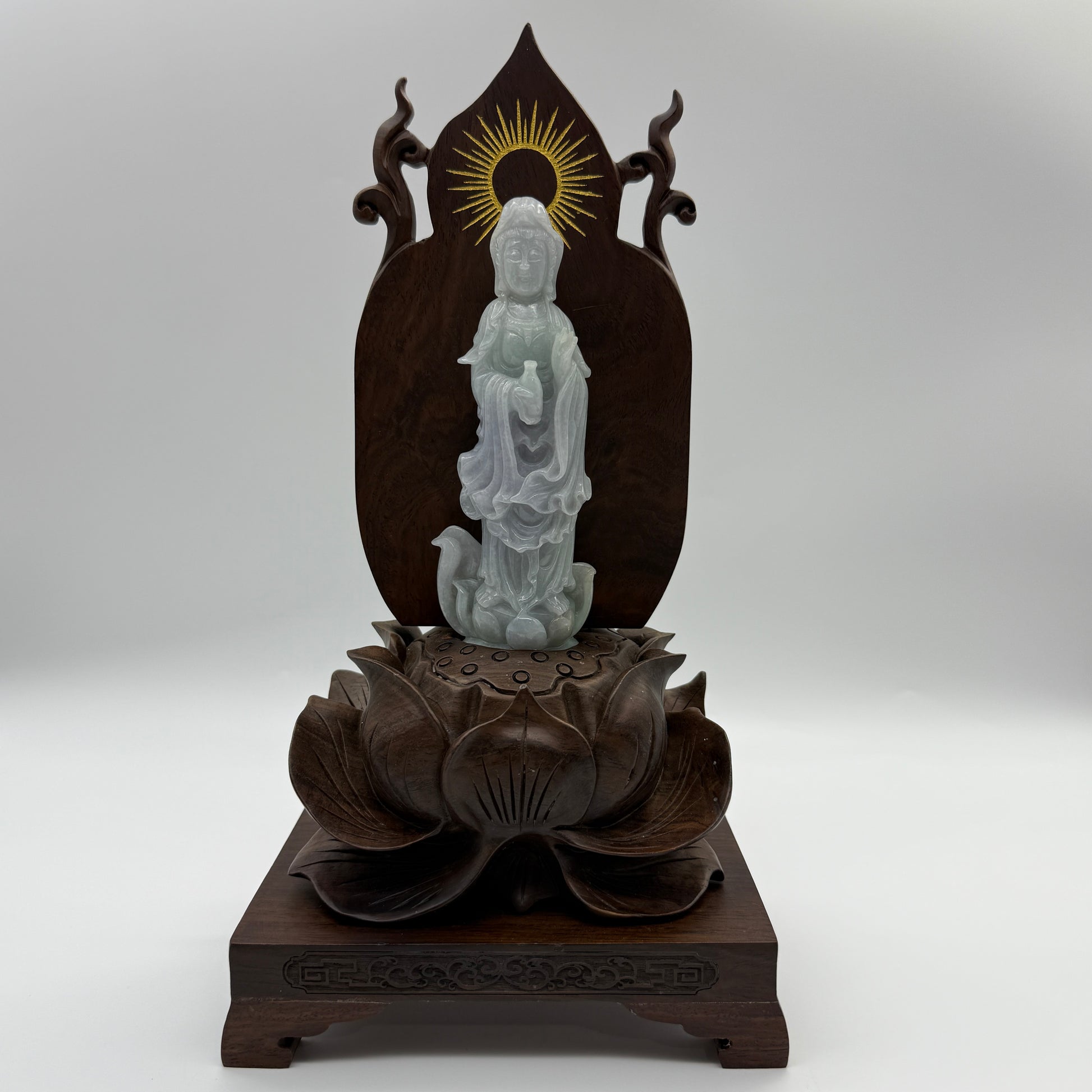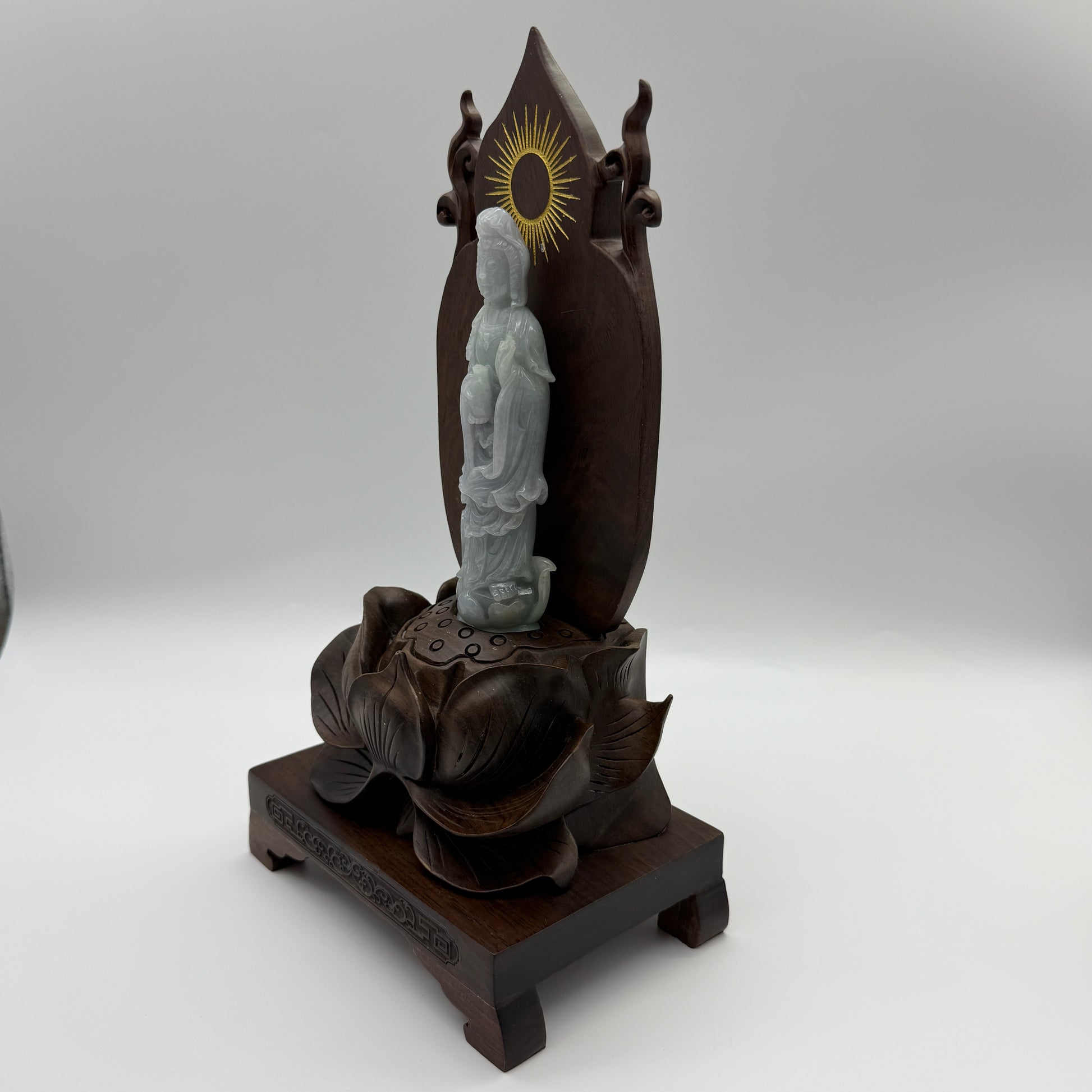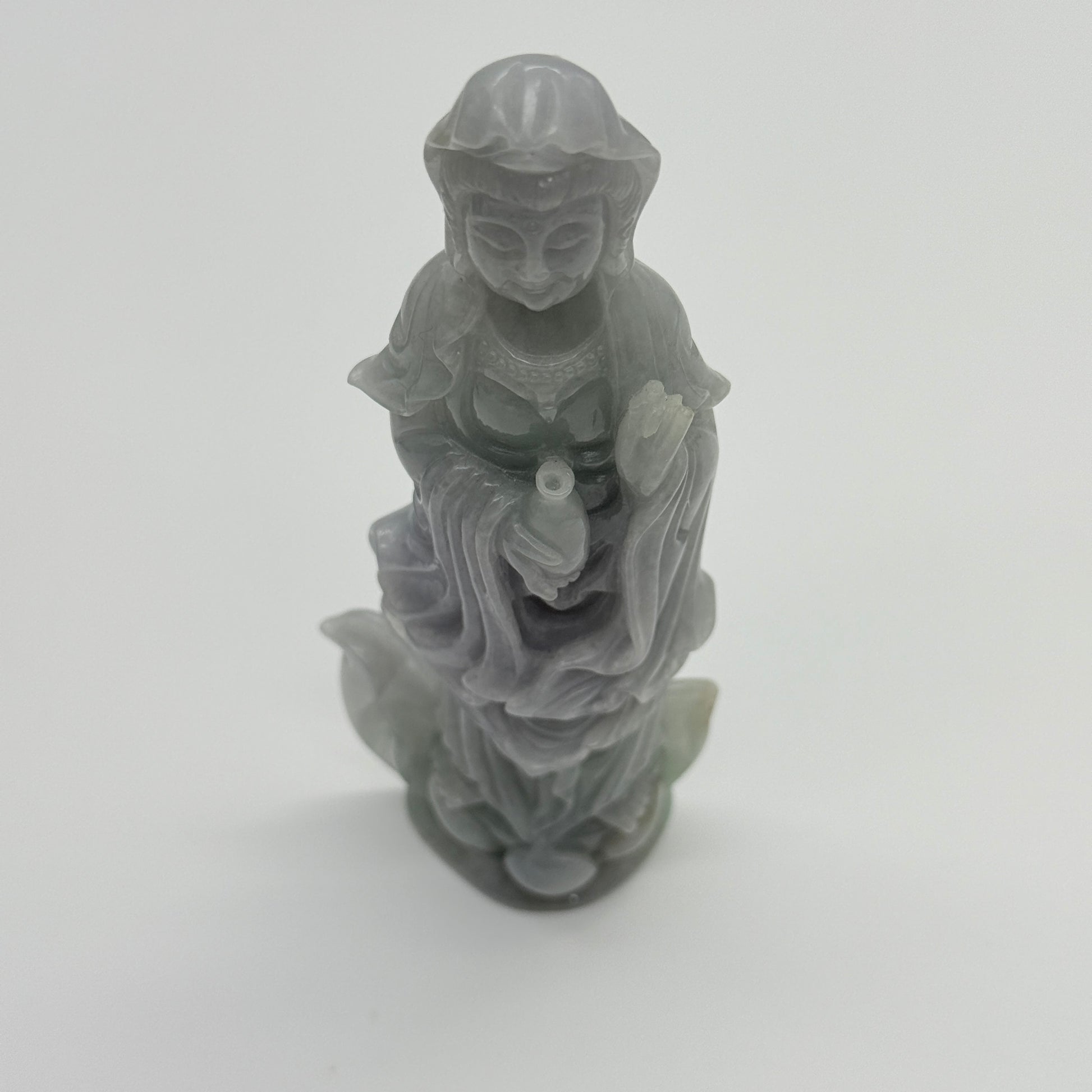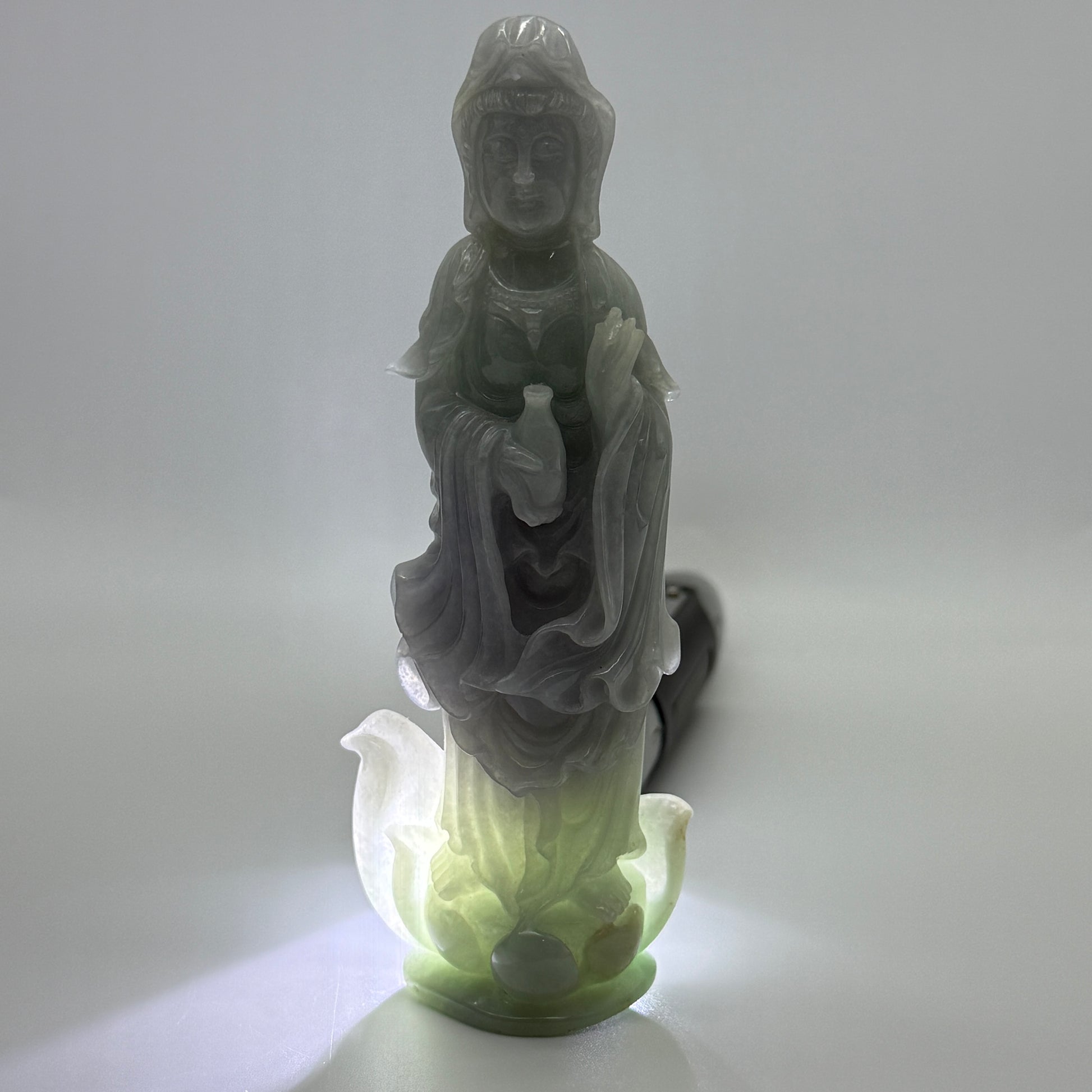 Type A Lavender and Green Jade Jadeite Guan Yin Display 210.5g 142.6 by 53.6 by 24.1mm with wooden stand total 1515g 310 by 152 by 106mm