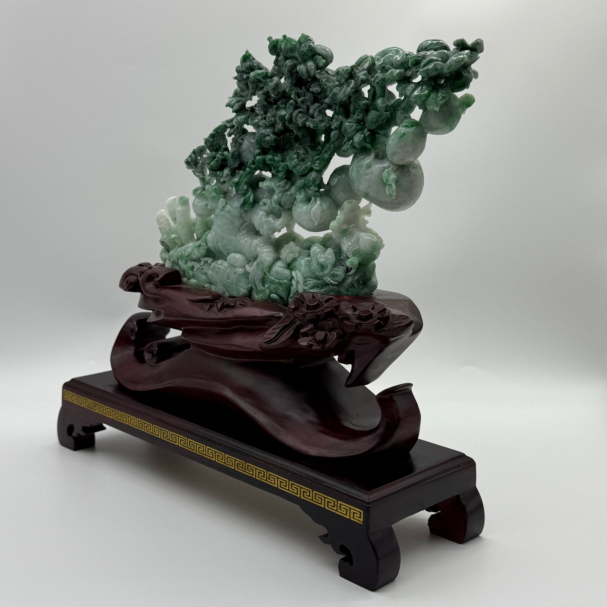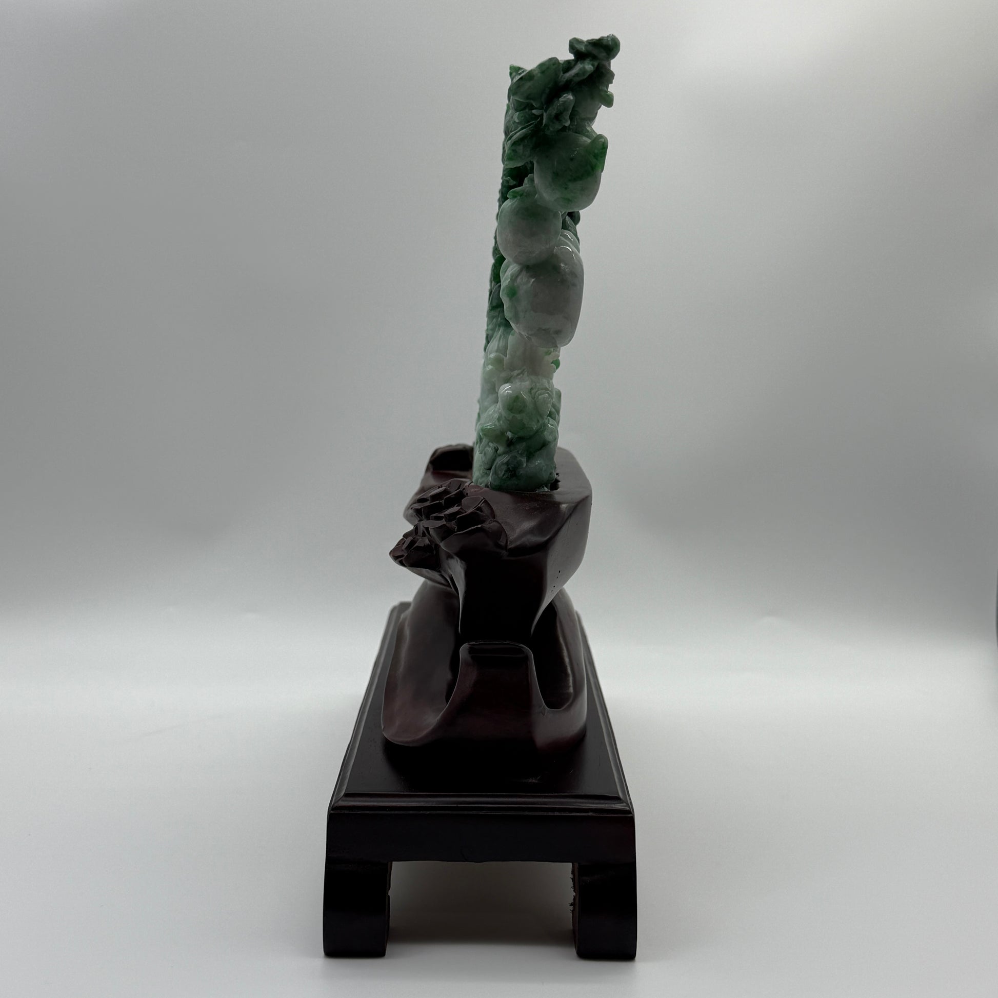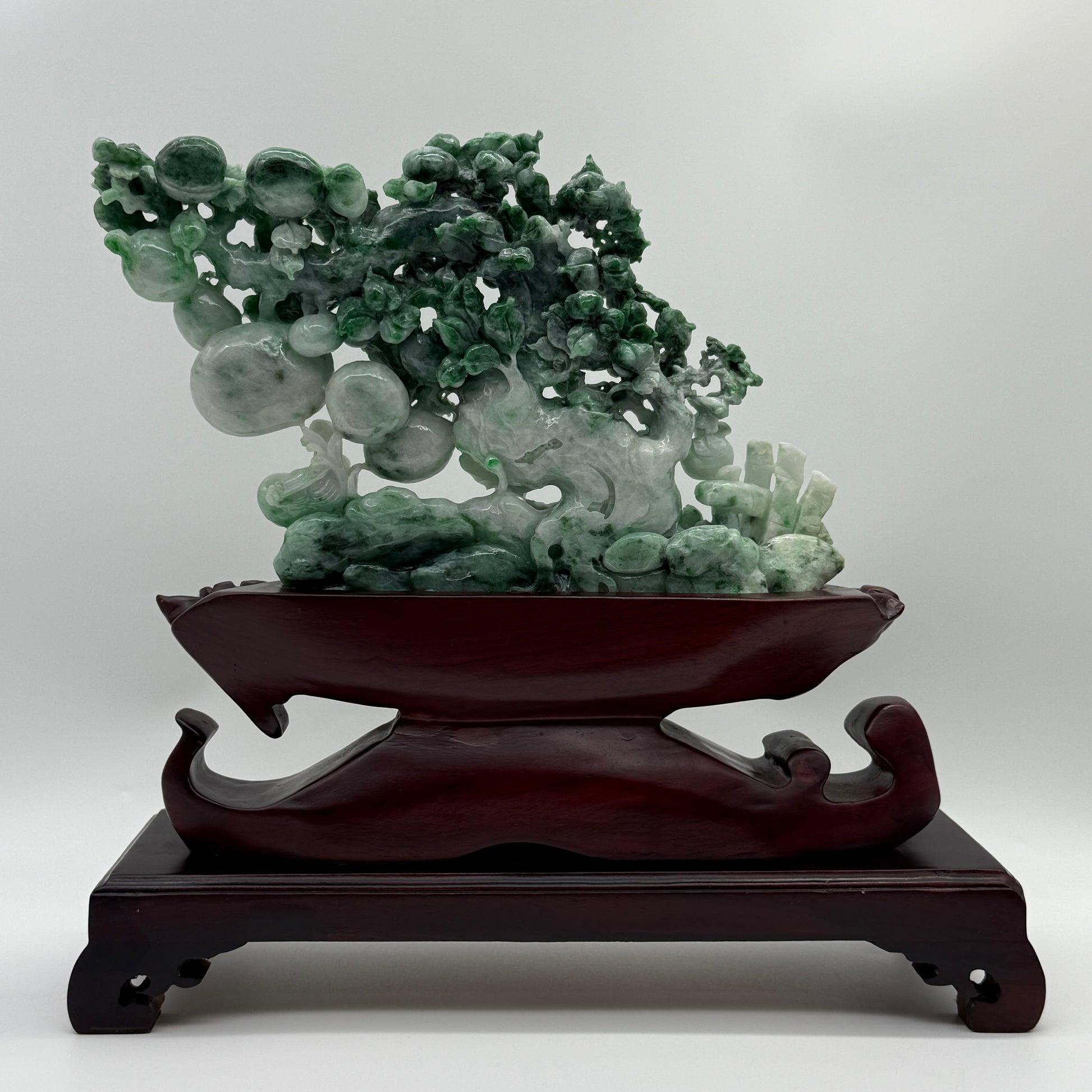 Type A Light Green with Spicy Green and Apple Green Patches Jadeite Tree with Twin Birds and Bamboo Display 1260g 24.0 by 2.8 by 16.0cm with wooden stand 2935g 31.0 by 10.0 by 28.0cm