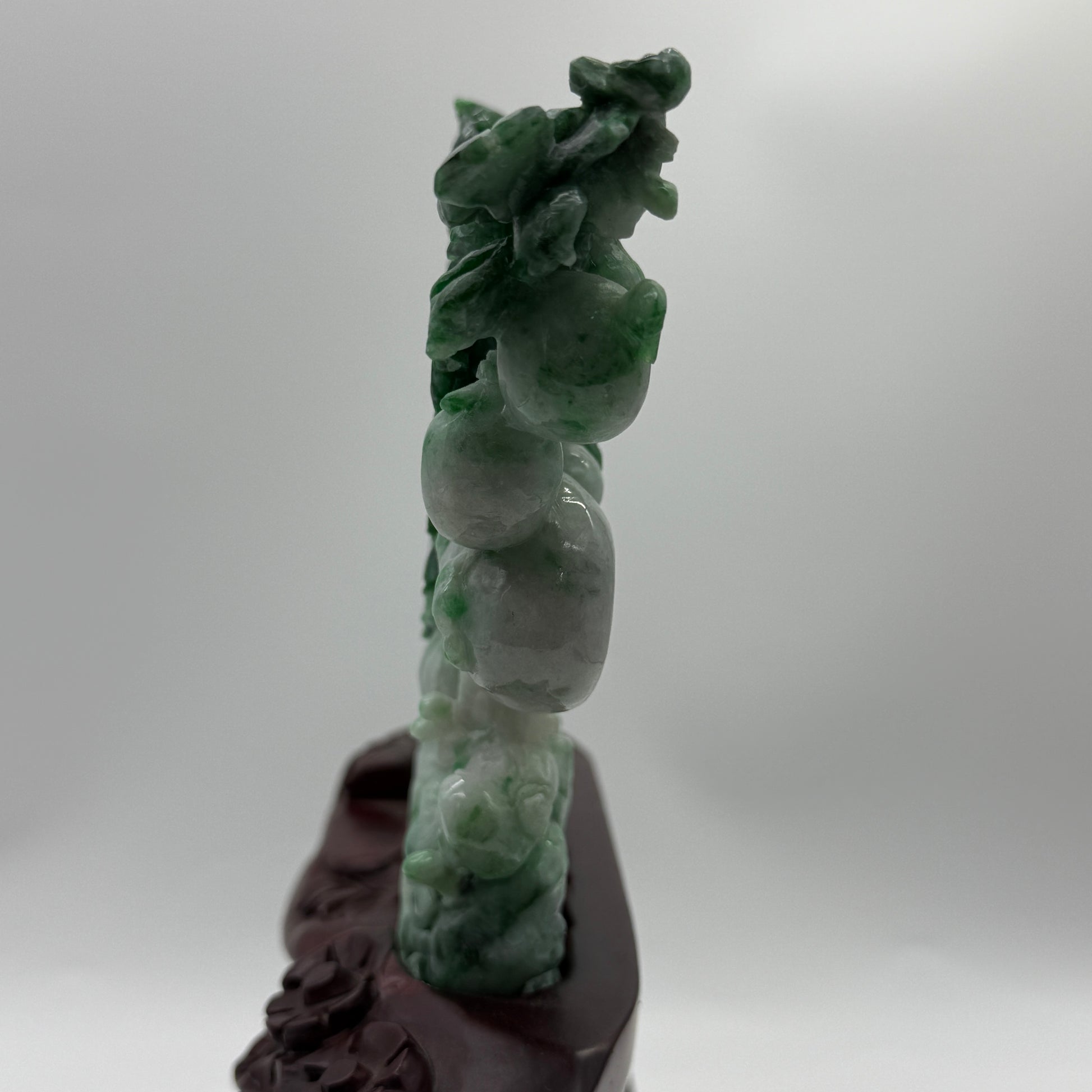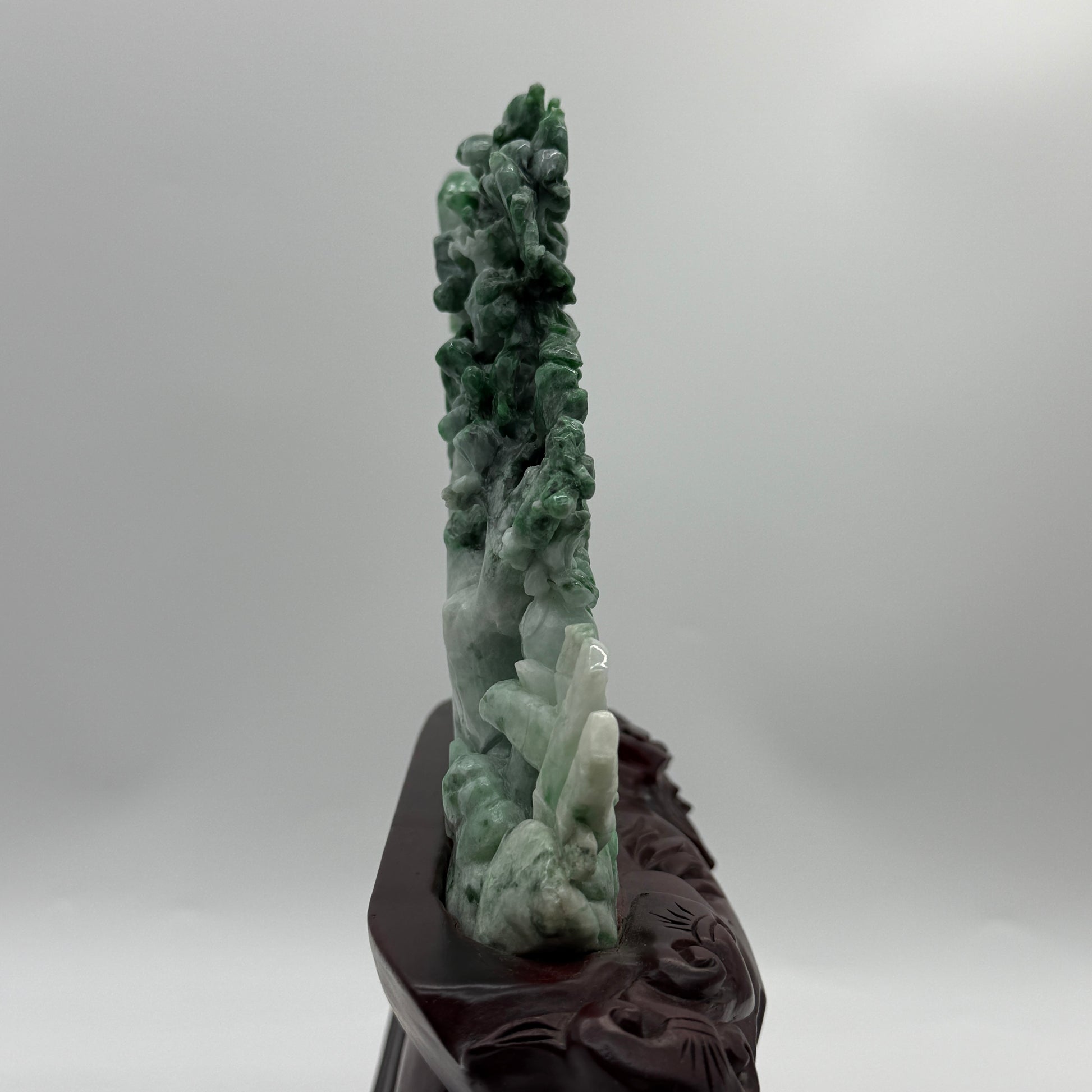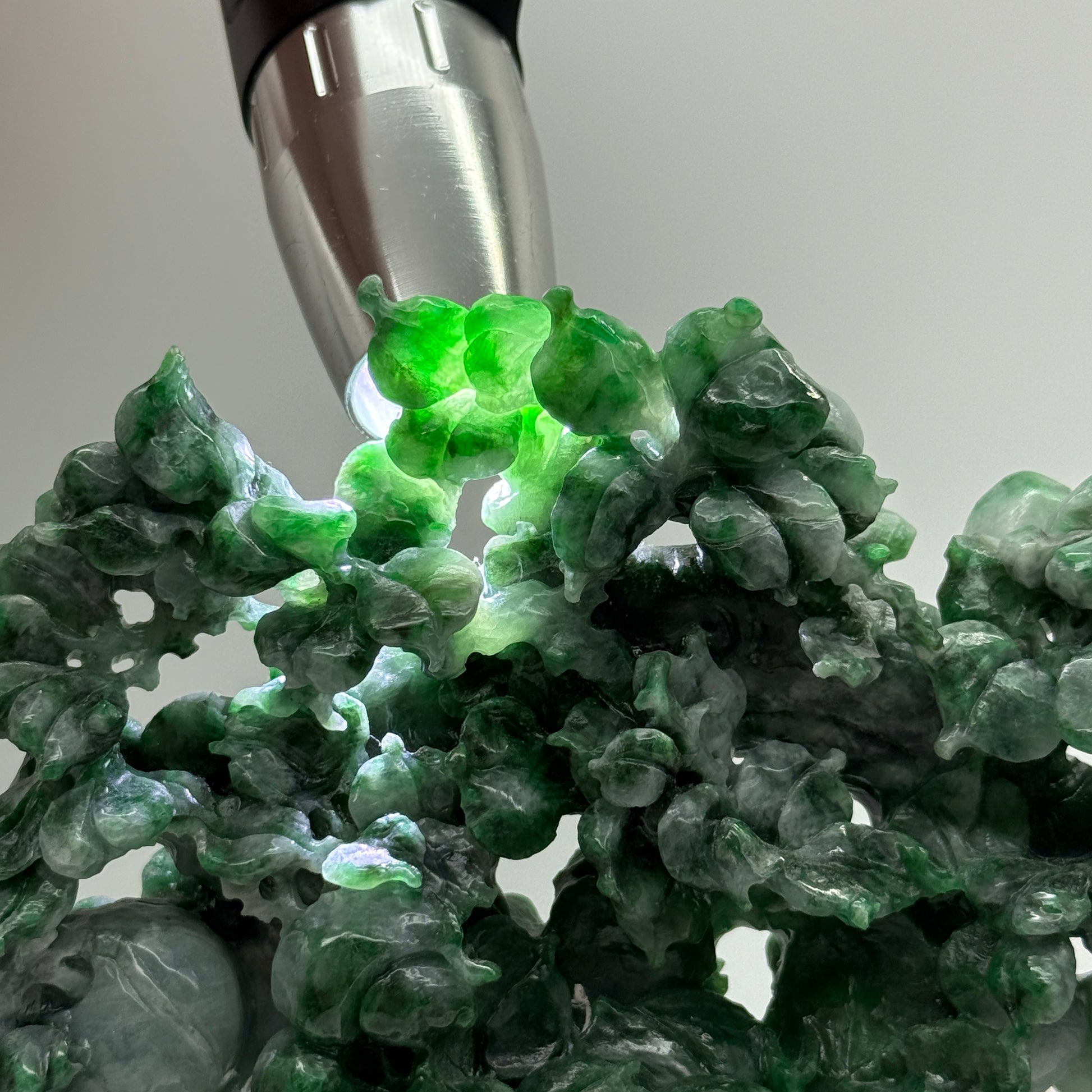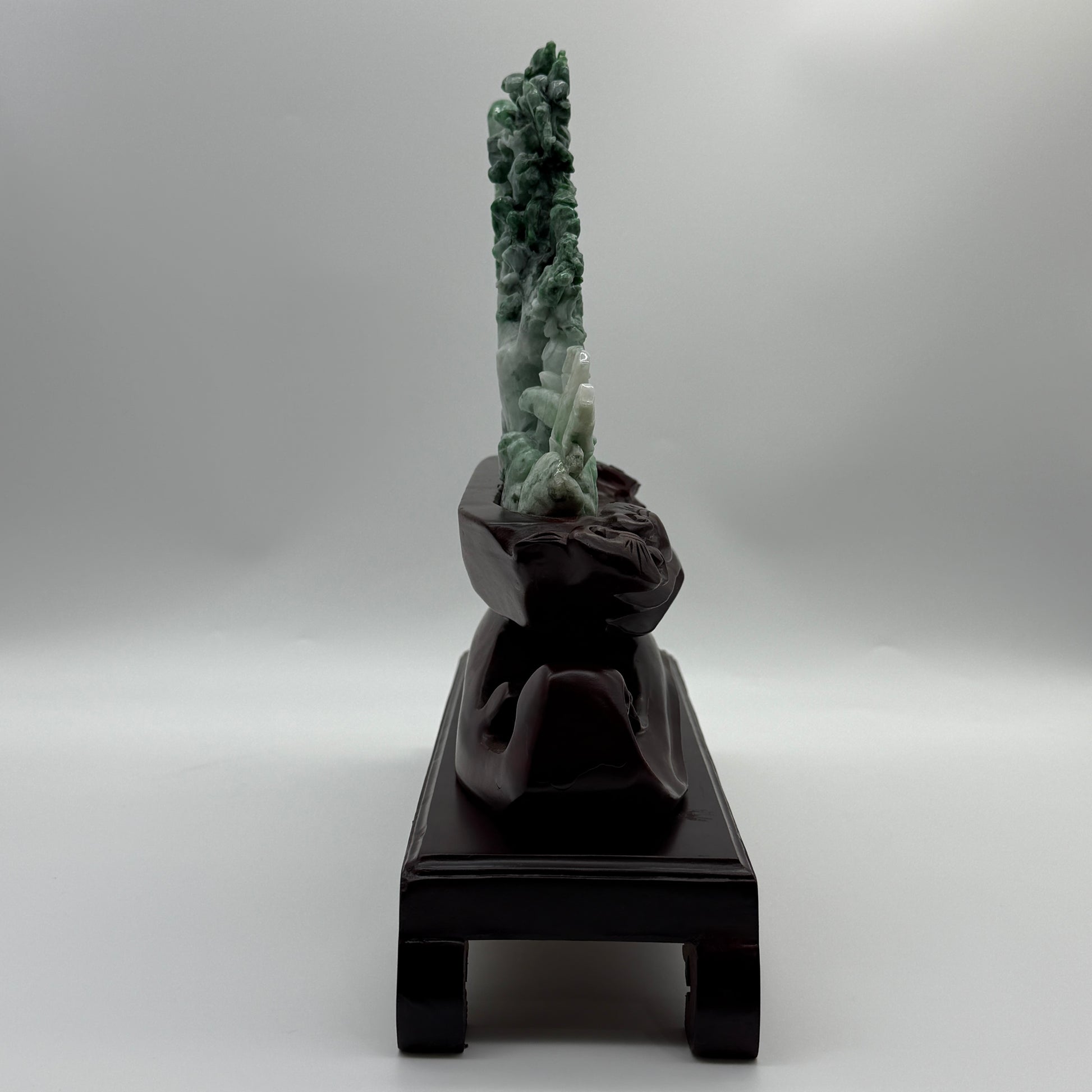 Type A Light Green with Spicy Green and Apple Green Patches Jadeite Tree with Twin Birds and Bamboo Display 1260g 24.0 by 2.8 by 16.0cm with wooden stand 2935g 31.0 by 10.0 by 28.0cm
