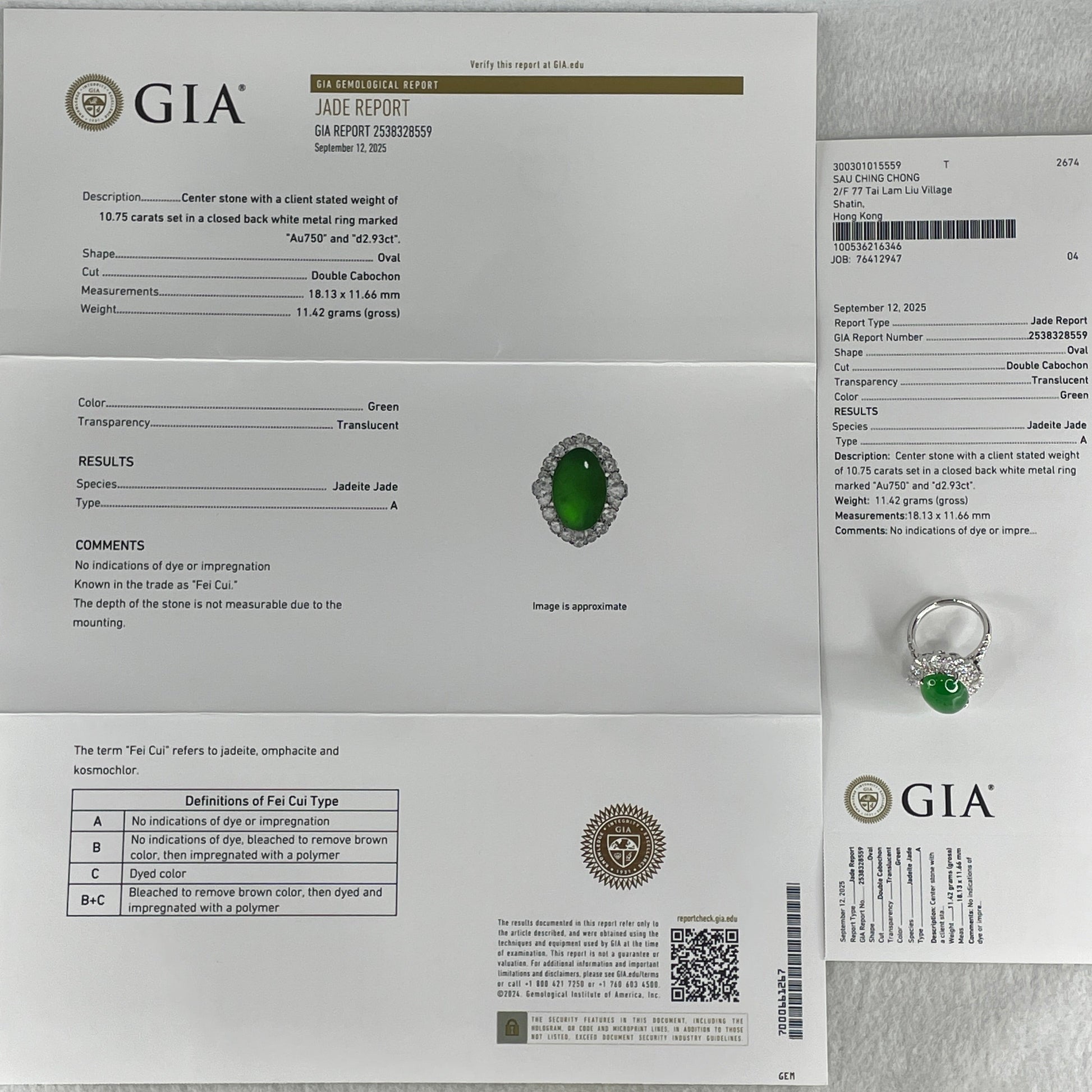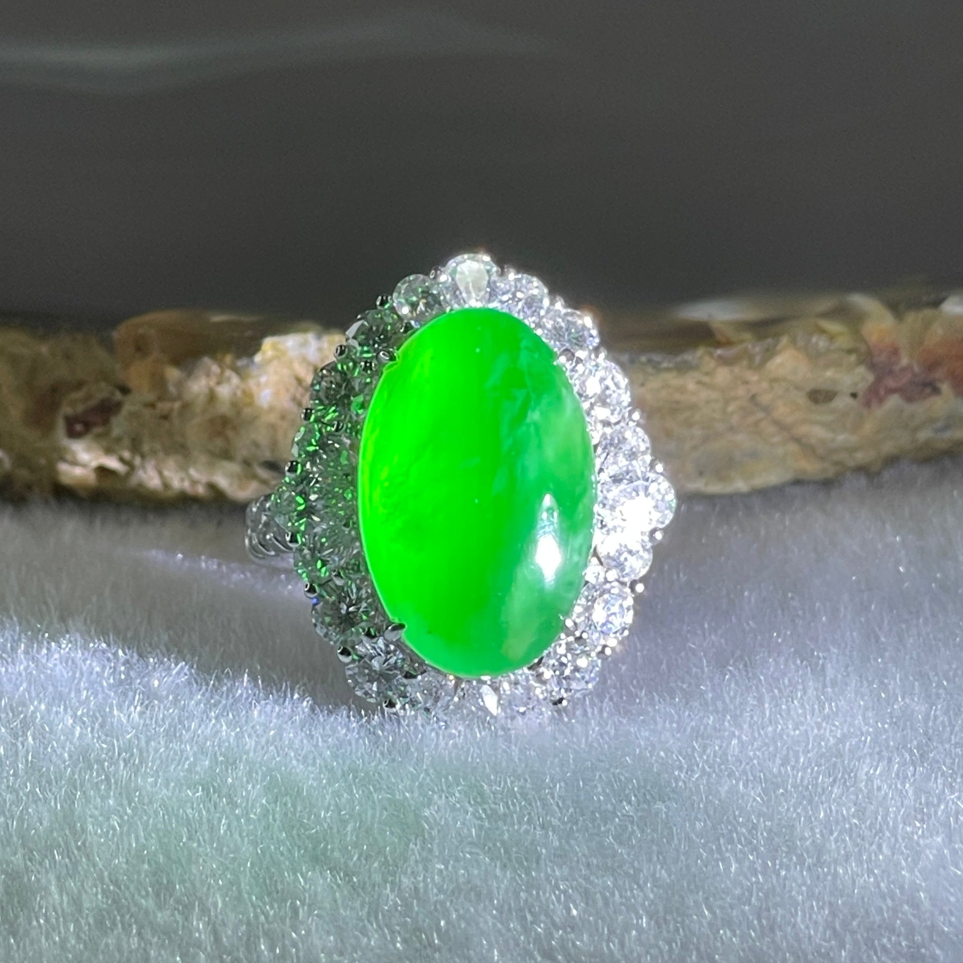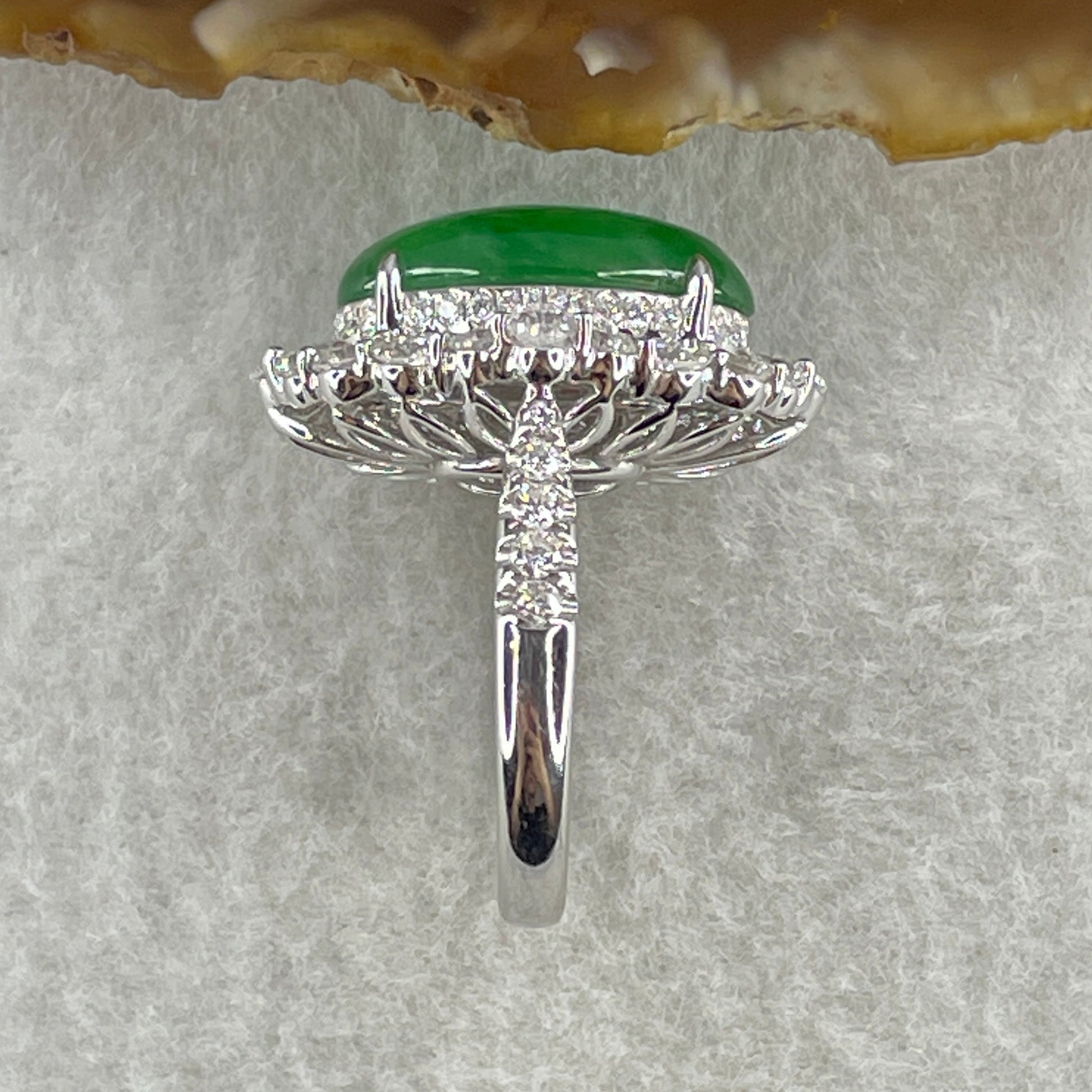 Very High Quality Highly Translucent TYPE A Natural Icy Intense Green Jadeite Oval Cabochon Approx 18.13 by 11.66mm Total Weight 11.42g including Natural Diamonds 2.93ct and Au750 White Gold Ring Setting US 7.25 HK 16 Inner Diameter 17.5mm with GIA Cert