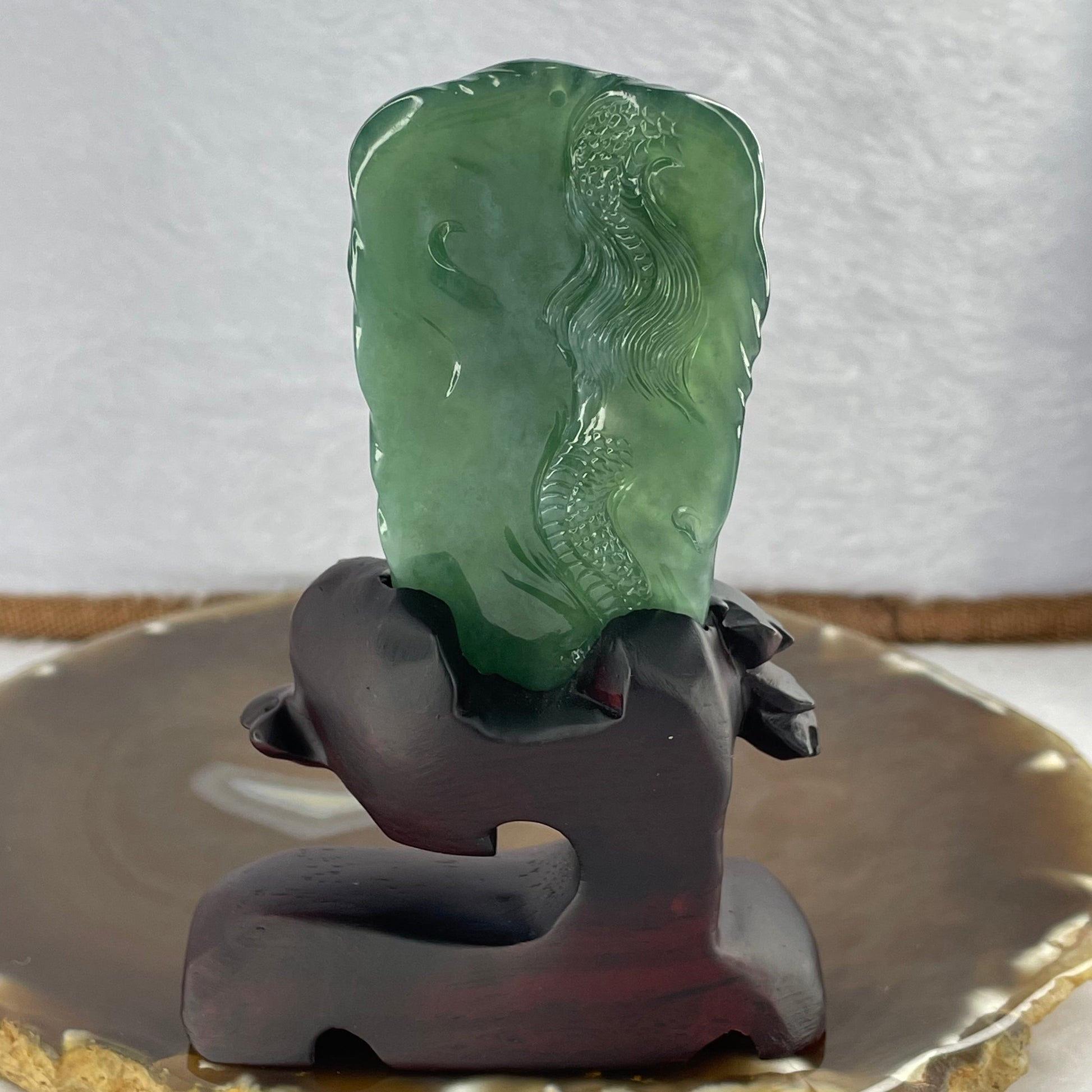 Very Rare High Icy Grand Master Type A Blueish Green Jadeite Fire Dragon with Fortune Wheel 53.03g 73.4 by 38.7 by 11.5mm with Wooden Stand