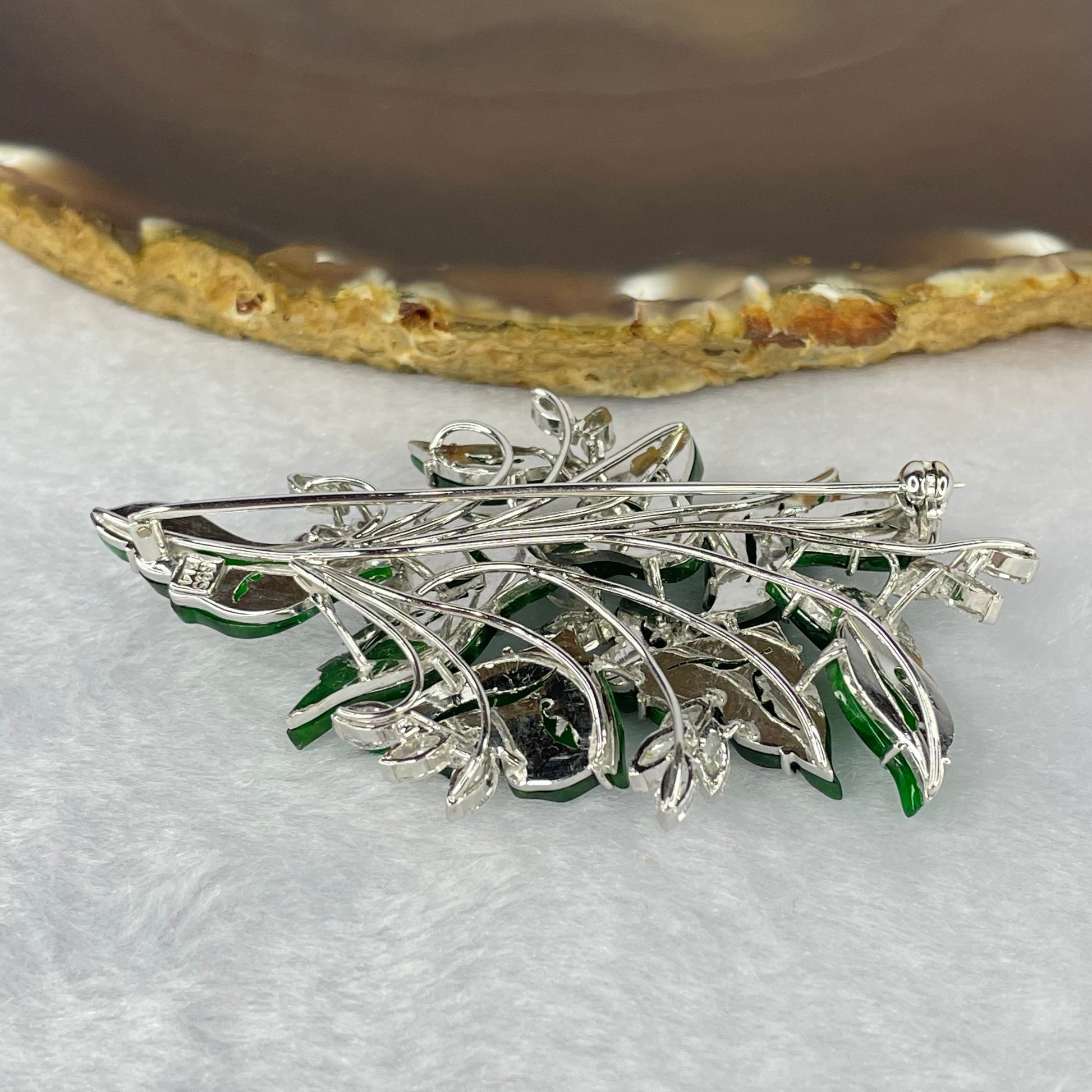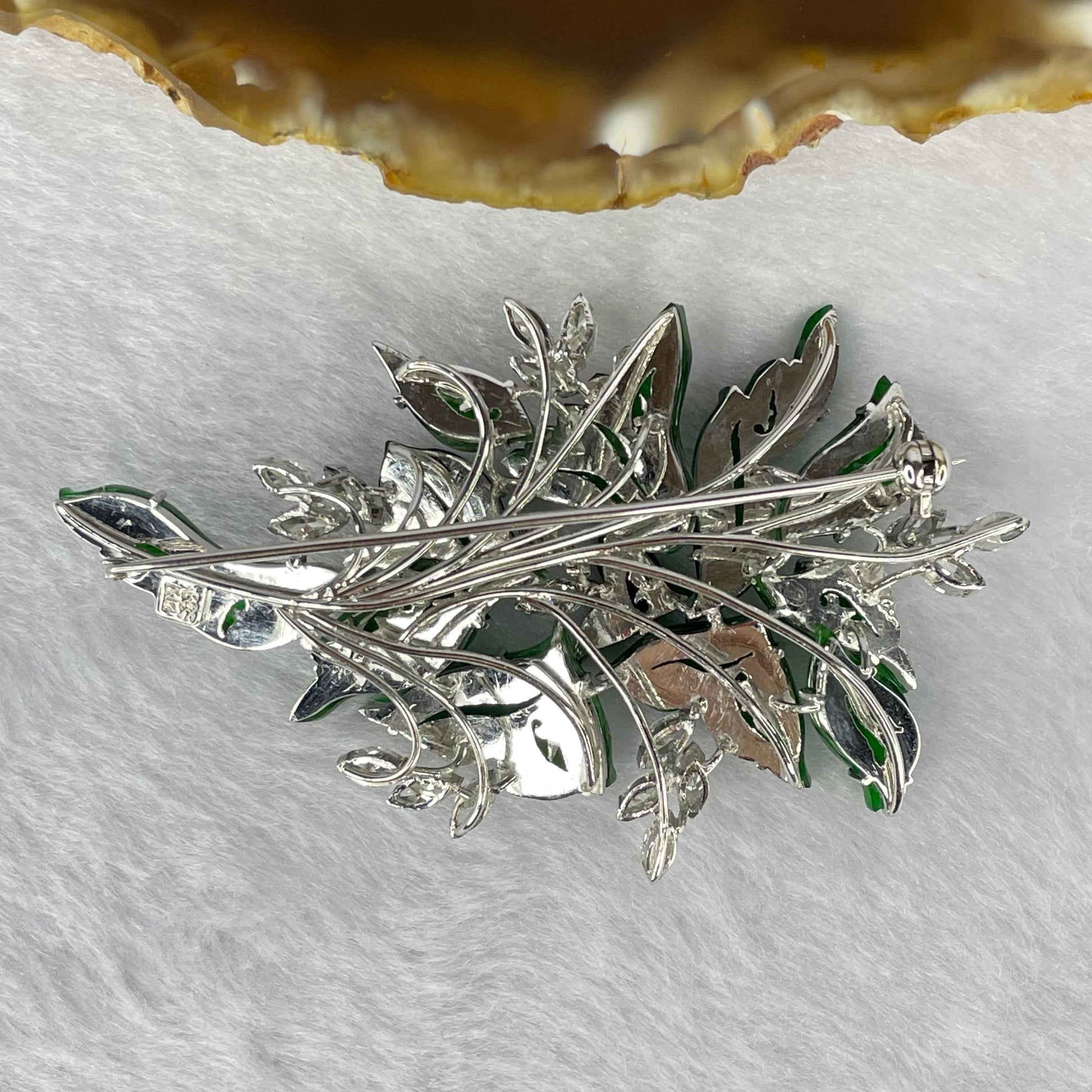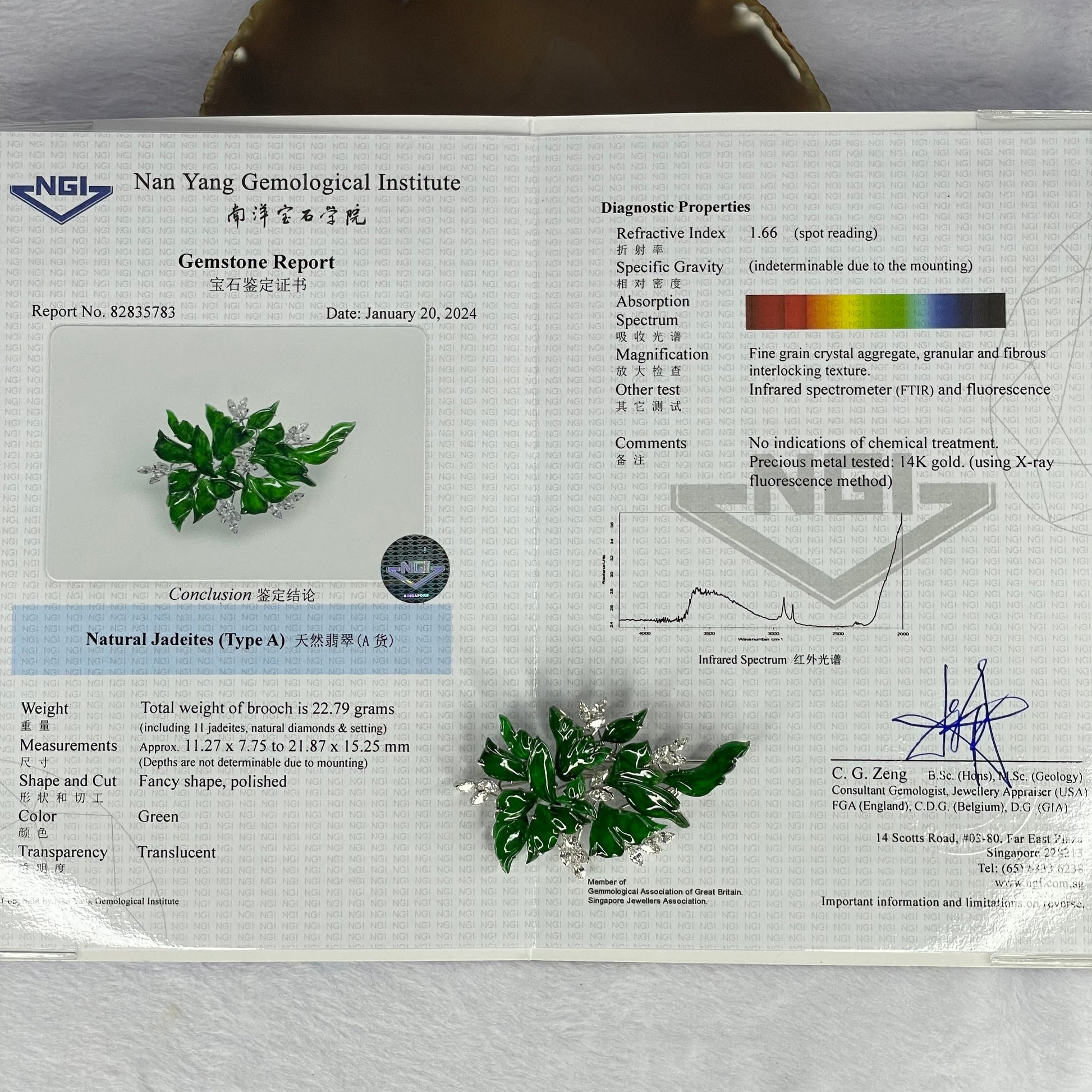 Very Very High Quality Translucent Natural Green Jadeite (TYPE A) Brooch Approx. 11.27 by 7.75 to 21.87 by 15.25mm Total Weight 22.79g including Natural Diamonds and 14K White Gold Setting with NGI Cert No.82835783